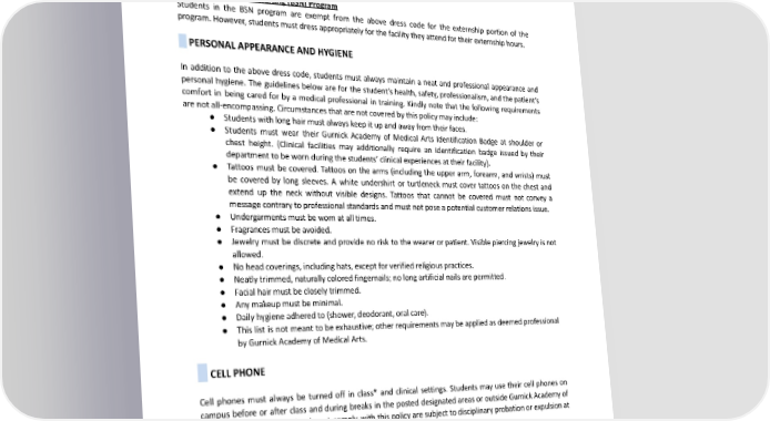 Physical Therapist Assistants and Ultrasound students must wear the Gurnick Academy of Medical Arts supplied shorts and shirts for the lab. Women must wear a tank top or sports bra if shirts are removed. Distance Education (Online) Programs Students enrolled in Distance Education (Online) programs, including B.S. in DMI, are not required to abide bytheabovedresscode. BachelorofScienceinNursing(BSN)Program Students in the BSN program are exempt from the above dress code for the externship portion of the program.However,studentsmustdressappropriatelyforthefacilitytheyattendfortheirexternshiphours. PERSONALAPPEARANCEANDHYGIENE In addition to the above dress code, students must always maintain a neat and professional appearance and personal hygiene. The guidelines below are for the student’s health, safety, professionalism, and the patient’s comfort in being cared for by a medical professional in training. Kindly note that the following requirements are not all-encompassing. Circumstances that are not covered by this policy may include: ● Studentswithlonghairmustalwayskeepitupandawayfromtheirfaces. ● Students must wear their Gurnick Academy of Medical Arts Identification Badge at shoulder or chest height. (Clinical facilities may additionally require an identification badge issued by their departmenttobewornduringthestudents’clinicalexperiencesattheirfacility). ● Tattoos must be covered. Tattoos on the arms (including the upper arm, forearm, and wrists) must be covered by long sleeves. A white undershirt or turtleneck must cover tattoos on the chest and extend up the neck without visible designs. Tattoos that cannot be covered must not convey a messagecontrarytoprofessionalstandardsandmustnotposeapotentialcustomerrelationsissue. ● Undergarmentsmustbewornatalltimes. ● Fragrancesmustbeavoided. ● Jewelry must be discrete and provide no risk to the wearer or patient. Visible piercing jewelry is not allowed. ● Noheadcoverings,includinghats,exceptforverifiedreligiouspractices. ● Neatlytrimmed,naturallycoloredfingernails;nolongartificial nails are permitted. ● Facialhairmustbecloselytrimmed. ● Anymakeupmustbeminimal. ● Dailyhygieneadheredto(shower,deodorant,oralcare). ● This list is not meant to be exhaustive; other requirements may be applied as deemed professional byGurnickAcademyofMedicalArts. CELLPHONE Cell phones must always be turned off in class* and clinical settings. Students may use their cell phones on campus before or after class and during breaks in the posted designated areas or outside Gurnick Academy of Medical Arts. Students who do not comply with this policy are subject to disciplinary probation or expulsion at thediscretion of the Gurnick Academy of Medical Arts administration. *Please note that some instructors may allow restricted cellphone use in class for certain activities. ADMINISTRATIONOFEXAMINATION 134