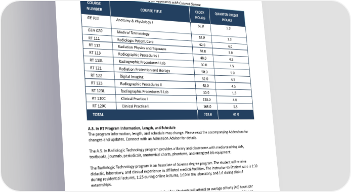 TOTAL 2,974.0 167.0 GeneralEducationCoursesareidentifiedinItalics. Applicants who possess a current State of California Limited Permit (License) in Chest, Extremities, and Torso Skeletal will receive credit granting for the following courses. Table 48. A.S. in RT Program Credit Granting for Applicants with Current License COURSE CLOCK QUARTERCREDIT COURSETITLE NUMBER HOURS HOURS GE011 Anatomy&PhysiologyI 56.0 5.5 GEH020 MedicalTerminology 18.0 1.5 RT111 Radiologic Patient Care 42.0 4.0 RT112 Radiation Physics and Exposure 58.0 5.0 RT113 Radiographic Procedures I 48.0 4.5 RT113L Radiographic Procedures I Lab 30.0 1.5 RT121 Radiation Protection and Biology 50.0 5.0 RT122 Digital Imaging 52.0 4.5 RT123 Radiographic Procedures II 48.0 4.5 RT123L Radiographic Procedures II Lab 30.0 1.5 RT110C Clinical Practice I 128.0 4.0 RT120C Clinical Practice II 168.0 5.5 TOTAL 728.0 47.0 A.S. in RT Program Information, Length, and Schedule Theprograminformation,length,andschedulemaychange.PleasereadtheaccompanyingAddendumfor changesandupdates.ConnectwithanAdmissionAdvisorfordetails. TheA.S.inRadiologicTechnologyprogramprovidesalibraryandclassroomswithmediateachingaids, textbooks, journals, periodicals, anatomical charts, phantoms, and energized lab equipment. TheRadiologicTechnologyprogramisanAssociateofSciencedegreeprogram.Thestudentwillreceive didactic, laboratory, and clinical experience in affiliated medical facilities. The Instructor-to-Student ratio is 1:30 during residential lectures, 1:25 during online lectures, 1:10 in the laboratory, and 1:1 during clinical externships. Classes may be scheduled MondaythroughSunday.Studentswillattendanaverageofforty(40)hoursper weekofinstruction, including didactic, labs, and clinical. Clinical activities may be held during weekdays or weekends,andshiftsmayincludeday,evening,orgraveyardastheclinicalsiterequires.Didacticcoursesare held between8:00AMto8:00PM. Theprogram’saffiliated clinical sites hold current state-issued certificates as approved clinical sites. The clinical sites provide supervised clinical instruction in the patient care setting. All clinical sites employ radiologic 204