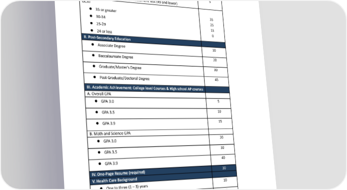 I. Admissions Exam Possible Points 25 ● Anatomy&PhysiologyAssessmentTest(100-85) 20 ● Anatomy&PhysiologyAssessmentTest(84-80) 15 ● Anatomy&PhysiologyAssessmentTest(79-69) 10 ● Anatomy&PhysiologyAssessmentTest(68-50) 5 ● Anatomy&PhysiologyAssessmentTest(49andlower) UCAT ● 35orgreater 35 25 ● 30-34 15 ● 25-29 0 ● 24orless II. Post-Secondary Education 10 ● AssociateDegree 20 ● BaccalaureateDegree 30 ● Graduate/Master’sDegree 45 ● Post-Graduate/DoctoralDegree III. Academic Achievement: College level Courses & High school AP courses A. Overall GPA 5 ● GPA3.0 10 ● GPA3.5 15 ● GPA3.9 B. MathandScienceGPA 20 ● GPA3.0 30 ● GPA3.5 40 ● GPA3.9 IV. One-Page Resume(required) 30 V. Health Care Background 10 ● Onetothree(1–3)years 25 ● Morethanthree(3)years VI. Reapplication (having completed reapplication requirements) 15 VII. Personal Interview 150 ● InterviewQuestions ● Maturity 28
