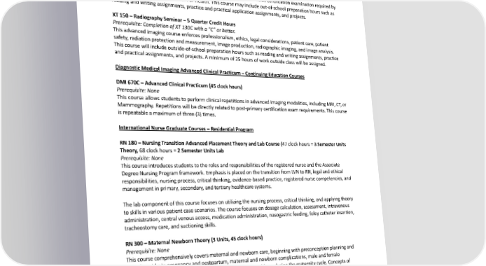 Prerequisite: Completion of XT 130C with a “C” or better. This course provides 120 hours of supervised clinical instruction and experience in an approved x-ray departmentofanauthorizedclinicalfacility concentrating on chest, extremity, and torso skeletal radiography. Backoffice and medical skills are also included. Students must meet attendance requirements and satisfactorily completetheexternshipobjectives. This course helps prepare students for the limited permit x-ray technician certification examination required by theStateofCalifornia Department of Health. This course may include out-of-school preparation hours such as reading and writing assignments, practice and practical application assignments, and projects. XT150–RadiographySeminar–5QuarterCreditHours Prerequisite: Completion of XT 130C with a “C” or better. This advanced imaging course enforces professionalism, ethics, legal considerations, patient care, patient safety, radiation protection and measurement, image production, radiographic imaging, and image analysis. This course will include outside-of-school preparation hours such as reading and writing assignments, practice andpractical assignments, and projects. A minimum of 25 hours of work outside class will be assigned. Diagnostic Medical Imaging Advanced Clinical Practicum – Continuing Education Courses DMI670C–AdvancedClinicalPracticum(45clockhours) Prerequisite: None This course allows students to perform clinical repetitions in advanced imaging modalities, including MRI, CT, or Mammography. Repetitionswillbedirectlyrelatedtopost-primarycertification exam requirements. This course is repeatable a maximum of three (3) times. International Nurse Graduate Courses – Residential Program RN180–NursingTransitionAdvancedPlacementTheoryandLabCourse(47clockhours=3SemesterUnits Theory, 68 clock hours = 2 Semester Units Lab Prerequisite: None This course introduces students to the roles and responsibilities of the registered nurse and the Associate DegreeNursingProgramframework.EmphasisisplacedonthetransitionfromLVNtoRN,legalandethical responsibilities, nursing process, critical thinking, evidence-based practice, registered nurse competencies, and managementinprimary,secondary,andtertiaryhealthcaresystems. Thelabcomponentofthiscoursefocusesonutilizingthenursingprocess,criticalthinking,andapplyingtheory to skills in various patient case scenarios. The course focuses on dosage calculation, assessment, intravenous administration, central venous access, medication administration, nasogastric feeding, foley catheter insertion, tracheostomycare,andsuctioningskills. RN300–MaternalNewbornTheory(3Units,45clockhours) Prerequisite: None This course comprehensively covers maternal and newborn care, beginning with preconception planning and including risks in pregnancy and postpartum, maternal and newborn complications, male and female reproductive problems and needs, and family needs and problems during the maternity cycle. Concepts of nutrition, cultural variations, and the safety of mothers and newborns are integrated. Therapeutic use of drugs during pregnancy, labor and delivery, and the immediate postpartum period are included. RN301–MaternalNewbornClinical(1.5Units,67.5clockhours) Prerequisite: None 318