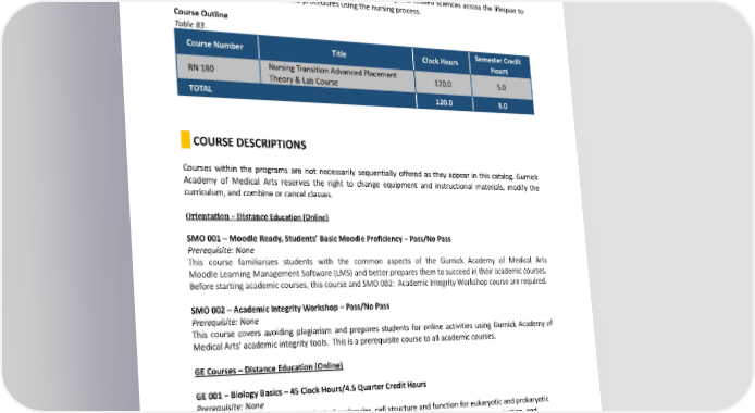 13. Exhibit accuracy in mathematical calculations related to safe and efficacious administration of fluids andmedications. 14. Embodyunderstandingandskillsinperforminghealthhistoryandphysicalassessment. 15. Enact a knowledge and ability to perform basic and complex nursing skills in caring for acute and chronically ill patients utilizing critical thinking skills. 16. Execute accurate documentation related to the assessment and performance of skills. 17. Apply knowledge of theory and principles from nursing and related sciences across the lifespan to selected nursing skills and procedures using the nursing process. CourseOutline Table 83. SemesterCredit CourseNumber Title Clock Hours Hours Nursing Transition Advanced Placement RN180 120.0 5.0 Theory&LabCourse TOTAL 120.0 5.0 COURSEDESCRIPTIONS Courses within the programs are not necessarily sequentially offered as they appear in this catalog. Gurnick Academy of Medical Arts reserves the right to change equipment and instructional materials, modify the curriculum, and combine or cancel classes. Orientation–DistanceEducation(Online) SMO001–MoodleReady,Students’BasicMoodleProficiency–Pass/NoPass Prerequisite: None This course familiarizes students with the common aspects of the Gurnick Academy of Medical Arts Moodle Learning ManagementSoftware(LMS)andbetterpreparesthemtosucceed in theiracademic courses. Before starting academic courses, this course and SMO 002: Academic Integrity Workshop course are required. SMO002–AcademicIntegrityWorkshop–Pass/NoPass Prerequisite: None This course covers avoiding plagiarism and prepares students for online activities using Gurnick Academy of MedicalArts’ academic integrity tools. This is a prerequisite course to all academic courses. GECourses–DistanceEducation(Online) GE001–BiologyBasics–45ClockHours/4.5QuarterCreditHours Prerequisite: None This course introduces major biological molecules, cell structure and function for eukaryotic and prokaryotic organisms, cell cycle, genetics, sexual and asexual reproduction, bioenergetics, cell communication, and signaling. This is a General Education Course. GE002–PrinciplesofPhysics–45ClockHours/4.5QuarterCreditHours/3SemesterCreditHours Prerequisites: None This is a conceptual physics course for non-science majors. This course aims to facilitate students’ understanding of the rules of nature by learning the foundations. This course covers forces and motion, 248