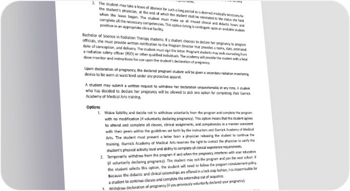 clinical affiliate can guarantee that the student would not exceed the occupational limits of 0.5 rem during the entire gestational period. This option means that the student agrees to attend and complete all classes, clinical assignments, and competencies in a manner consistent with her peers within the guidelines set forth by the instructors and Gurnick Academy of Medical Arts. The student must present a letter from a physician releasing the student to continue training. Gurnick Academy of Medical Arts reserves the right to contact the physician to verify the student’s physical activity level and ability to complete all clinical experience requirements. 2. The student maytakealeaveofabsenceforsuchalongperiodasisdeemedmedicallynecessaryby the student’s physician, at the end of which the student shall be reinstated to the status she held when the leave began. The student must make up all missed clinical and didactic hours and completeallthenecessarycompetencies.Thisoptiontimingiscontingentuponanavailablestudent position in an appropriate clinical facility. Bachelor of Science in Radiation Therapy students: If a student chooses to declare her pregnancy to program officials, she must provide written notification to the Program Director that provides a name, date, estimated date of conception, and delivery. The student must sign the letter. Pregnant students may seek counseling from a radiation safety officer (RSO) or other qualified individuals. The academy will provide the student with a fetal dosemonitorandinstructionsforuseuponthestudent’sdeclarationofpregnancy. Upon declaration of pregnancy, the declared pregnant student will be given a secondary radiation monitoring device to be worn at waist level under any protective apparel. A student may submit a written request to withdraw her declaration unquestionably at any time. A student who has decided to declare her pregnancy will be allowed to pick one option for completing their Gurnick AcademyofMedicalArtstraining. Options 1. Waive liability and decide not to withdraw voluntarily from the program and complete the program with no modification (if voluntarily declaring pregnancy). This option means that the student agrees to attend and complete all classes, clinical assignments, and competencies in a manner consistent with their peers within the guidelines set forth by the instructors and Gurnick Academy of Medical Arts. The student must present a letter from a physician releasing the student to continue the training. Gurnick Academy of Medical Arts reserves the right to contact the physician to verify the student’s physical activity level and ability to complete all clinical experience requirements. 2. Temporarily withdraw from the program if and when the pregnancy interferes with your education (if voluntarily declaring pregnancy). The student may exit the program and join the next cohort. If the student selects this option, the student will need to follow the program reinstatement policy. Because the didactic and clinical externships are offered in a lock-step fashion, it is impermissible for astudenttocontinueclassesandcompletetheexternshipoutofsequence. 3. Withdrawdeclarationofpregnancy(ifyoupreviouslyvoluntarilydeclaredyourpregnancy). If a declared pregnant student receives a dose of 0.05 rem (0.5 mSv) in any month of pregnancy or greater than 0.5 rem (5 mSv) at any time during the pregnancy, the student will be removed from the externship until after delivery. For students in the Dental Assistant, Associate of Occupational Science in Cardiac Ultrasound Technology, Associate of Occupational Science in Ultrasound Technology, Associate of Occupational Science in Vascular Ultrasound Technology, Associate of Science in Respiratory Care, and Associate of Science in Magnetic 131
