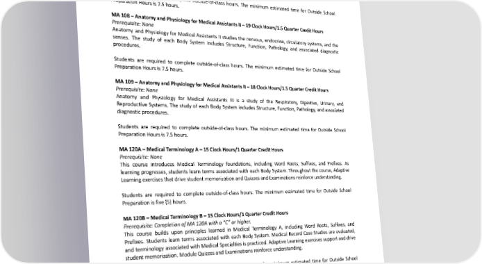 MA107–AnatomyandPhysiologyforMedicalAssistantsI–19ClockHours/1.5QuarterCreditHours Prerequisite: None Anatomy and Physiology for Medical Assistants I begins with an introduction to the foundation of Anatomy and Physiology, including levels of organization, organ systems, cell structure, and tissues and Membranes. The Integumentary, Skeletal, and Muscular Body Systems will be taught. The study of each Body System includes Structure, Function, Pathology, and associated diagnostic procedures. Students are required to complete outside-of-class hours. The minimum estimated time for Outside School Preparation Hours is 7.5 hours. MA108–AnatomyandPhysiologyforMedicalAssistantsII–19ClockHours/1.5QuarterCreditHours Prerequisite: None Anatomy and Physiology for Medical Assistants II studies the nervous, endocrine, circulatory systems, and the senses. The study of each Body System includes Structure, Function, Pathology, and associated diagnostic procedures. Students are required to complete outside-of-class hours. The minimum estimated time for Outside School Preparation Hours is 7.5 hours. MA109–AnatomyandPhysiologyforMedicalAssistantsII–18ClockHours/1.5QuarterCreditHours Prerequisite: None Anatomy and Physiology for Medical Assistants III is a study of the Respiratory, Digestive, Urinary, and Reproductive Systems. The study of each Body System includes Structure, Function, Pathology, and associated diagnostic procedures. Students are required to complete outside-of-class hours. The minimum estimated time for Outside School Preparation Hours is 7.5 hours. MA120A–MedicalTerminologyA–15ClockHours/1QuarterCreditHours Prerequisite: None This course introduces Medical Terminology foundations, including Word Roots, Suffixes, and Prefixes. As learning progresses, students learn terms associated with each Body System. Throughout the course, Adaptive Learning exercises that drive student memorization and Quizzes and Examinations reinforce understanding. Students are required to complete outside-of-class hours. The minimum estimated time for Outside School Preparation is five (5) hours. MA120B–MedicalTerminologyB–15ClockHours/1QuarterCreditHours Prerequisite: Completion of MA 120A with a “C” or higher. This course builds upon principles learned in Medical Terminology A, including Word Roots, Suffixes, and Prefixes. Students learn terms associated with each Body System. Medical Record Case Studies are evaluated, and terminology associated with Medical Specialties is practiced. Adaptive Learning exercises support and drive student memorization. ModuleQuizzesandExaminationsreinforceunderstanding. Students are required to complete outside-of-class hours. The minimum estimated time for Outside School Preparation is five (5) hours. MA200–BackOfficeClinicalFoundations–80ClockHours/4.5QuarterCreditHours Prerequisite: None This course introduces students to clinical patient care. Students will practice professional medical communication with patients and colleagues. Students are taught minor surgery assistance procedures, including setting up, instrument sterilization, and autoclave technique. They learn aseptic medical practice as 310