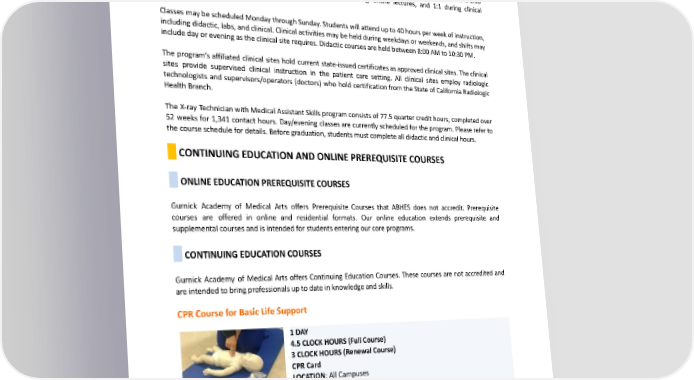 The X-ray Technician with Medical Assistant Skills program provides a library and classrooms with teaching aids, textbooks, journals, periodicals, anatomical charts, phantoms, and energized lab equipment. The X-ray Technician with Medical Assistant Skills program is a diploma program. The student will receive didactic, laboratory, and clinical experience in affiliated medical facilities. The Instructor-to-Student ratio is 1:10 for the laboratory, 1:30 during residential lectures, 1:25 during online lectures, and 1:1 during clinical externships. Classes may be scheduled MondaythroughSunday.Studentswillattendupto40hoursperweekofinstruction, including didactic, labs, and clinical. Clinical activities may be held during weekdays or weekends, and shifts may include day or evening as the clinical site requires. Didactic courses are held between 8:00 AM to 10:30 PM. The program’s affiliated clinical sites hold current state-issued certificates as approved clinical sites. The clinical sites provide supervised clinical instruction in the patient care setting. All clinical sites employ radiologic technologists and supervisors/operators (doctors) who hold certification from the State of California Radiologic Health Branch. The X-ray Technician with Medical Assistant Skills program consists of 77.5 quarter credit hours, completed over 52 weeks for 1,341 contact hours. Day/evening classes are currently scheduled for the program. Please refer to thecourseschedulefordetails.Beforegraduation,studentsmustcompletealldidacticandclinicalhours. CONTINUINGEDUCATIONANDONLINEPREREQUISITECOURSES ONLINEEDUCATIONPREREQUISITECOURSES Gurnick Academy of Medical Arts offers Prerequisite Courses that ABHES does not accredit. Prerequisite courses are offered in online and residential formats. Our online education extends prerequisite and supplementalcoursesandisintendedforstudentsenteringourcoreprograms. CONTINUINGEDUCATIONCOURSES Gurnick Academy of Medical Arts offers Continuing Education Courses. These courses are not accredited and are intended to bring professionals up to date in knowledge and skills. CPRCourseforBasicLifeSupport 1DAY 4.5 CLOCKHOURS(FullCourse) 3CLOCKHOURS(RenewalCourse) CPRCard LOCATION:AllCampuses DELIVERY:Residential AGurnickAcademystudent. CPRCourseRegistration Before registration, applicants must meet the following admission criteria: ● ProvideavalidPhotoIdentificationonthedayofthecourse. 234