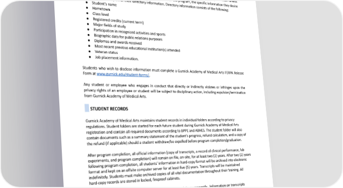 Notwithstanding the above, disclosure to Gurnick Academy of Medical Arts administration and faculty members with a legitimate educational purpose in seeing the records is permitted. Release of records to regulatory bodies, accrediting bodies, oversight bodies, and legally executed court subpoenas does not require student or parent release. Gurnick Academy of Medical Arts may release directory information without the student’s permission unless thestudentstates, in writing, within the first two (2) weeks of the program, the specific information they desire nottobeincludedaspartoftheirdirectoryinformation.Directoryinformationconsistsofthefollowing: ● Student’sname ● Hometown ● Classlevel ● Registeredcredits(currentterm) ● Majorfieldsofstudy ● Participationinrecognizedactivities and sports ● Biographicdataforpublicrelationspurposes ● Diplomasandawardsreceived ● Mostrecentpreviouseducationalinstitution(s)attended ● Veteranstatus ● Jobplacementinformation. Students who wish to disclose information must complete a Gurnick Academy of Medical Arts FERPA Release Formatwww.gurnick.edu/student-forms/. Any student or employee who engages in conduct that directly or indirectly violates or infringes upon the privacy rights of an employee or student will be subject to disciplinary action, including expulsion/termination fromGurnickAcademyofMedicalArts. STUDENTRECORDS Gurnick AcademyofMedicalArtsmaintainsstudentrecordsinindividualfoldersaccordingtoprivacy regulations. Student folders are started for each future student during Gurnick Academy of Medical Arts registration and contain all required documents according to BPPE and ABHES. The student folder will also contain documentssuchasasummarystatementofthestudent’sprogress,refundcalculation,andacopyof therefund(if applicable) should a student withdraw/be expelled before program completion/graduation. After program completion, all official information (copy of transcripts, a record of clinical performance, lab experiments, and program completion) will remain on file, on-site, for at least two (2) years. After two (2) years following program completion, all students’ information in hard-copy format will be archived into electronic formatandkeptonanoffsitecomputerserverforatleastfive(5)years.Transcriptswillbemaintained indefinitely. Students must make archived copies of all vital documentation throughout their training. All hard-copyrecordsarestoredinlocked,fireproofcabinets. Gurnick AcademyofMedicalArtsmaintainsstudenttranscriptspermanently. Informationontranscripts includes the following: ● Coursesoreducationalprogramsthatwerecompletedorwereattemptedbutnotcompleted,andthe dates of completion or withdrawal; ● Thefinalgradesorevaluationsgiventothestudent; ● Creditforcoursesearnedatotherinstitutions; ● Creditbasedonexperientiallearning; ● Creditbasedonadvancedplacement; 118