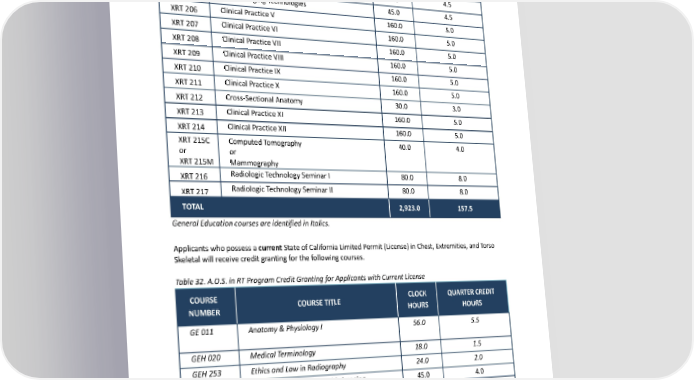 Clinical Practice IV 120.0 4.0 XRT110 ImagingProceduresandTechnicalFactors 30.0 3.0 XRT201 Radiographic Procedures III 80.0 7.0 XRT202 Radiographic Procedures IV 45.0 4.0 XRT203 Radiographic Procedures V 50.0 4.5 XRT204 Digital Imaging Technologies 45.0 4.5 XRT205 Clinical Practice V 160.0 5.0 XRT206 Clinical Practice VI 160.0 5.0 XRT207 Clinical Practice VII 160.0 5.0 XRT208 Clinical Practice VIII 160.0 5.0 XRT209 Clinical Practice IX 160.0 5.0 XRT210 Clinical Practice X 160.0 5.0 XRT211 Cross-Sectional Anatomy 30.0 3.0 XRT212 Clinical Practice XI 160.0 5.0 XRT213 Clinical Practice XII 160.0 5.0 XRT214 XRT215C ComputedTomography 40.0 4.0 or or XRT215M Mammography Radiologic Technology Seminar I 80.0 8.0 XRT216 Radiologic Technology Seminar II 80.0 8.0 XRT217 TOTAL 2,923.0 157.5 GeneralEducationcoursesareidentifiedinItalics. Applicants who possess a current State of California Limited Permit (License) in Chest, Extremities, and Torso Skeletal will receive credit granting for the following courses. Table 32. A.O.S. in RT Program Credit Granting for Applicants with Current License COURSE CLOCK QUARTERCREDIT COURSETITLE NUMBER HOURS HOURS GE011 Anatomy&PhysiologyI 56.0 5.5 GEH020 MedicalTerminology 18.0 1.5 GEH253 Ethics and Law in Radiography 24.0 2.0 Patient Care in Radiographic Imaging 45.0 4.0 XRT101 Radiographic Procedures I 70.0 6.0 XRT102 Radiographic Equipment and Exposure 50.0 5.0 XRT103 Radiographic Procedures II 70.0 6.0 XRT104 Radiation Protection and Physics 70.0 7.0 XRT105 179