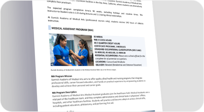 semester is 15 weeks long and covers two (2) courses. Course instructors will open a new lecture each weekday, and assignments must be submitted by the deadlines set by the course instructors and indicated in the course syllabi. At Gurnick Academy of Medical Arts, students receive 540 didactic instruction hours. The two (2) practicum courses require the student to do five to six (5 – 6) hours each week with a preceptor for eight (8) weeks. Students must obtain their local preceptor based on their work or residence. Gurnick Academy of Medical Arts has agreements with multiple healthcare facilities in the Bay Area, California, where students can alternatively completetheirpracticum. The expected program completion time is 90 weeks, excluding holidays and vacation times. The Instructor-to-Student ratio is 1:25 during lectures and 1:1 during clinical externships. At Gurnick Academy of Medical Arts (professional courses only), students receive 540 hours of didactic instruction. MEDICALASSISTANTPROGRAM(MA) 30WEEKS 948.5CLOCKHOURS 44.5 QUARTERCREDITHOURS CERTIFICATEPROGRAM,3MODULES STANDARDOCCUPATIONALCLASSIFICATION(SOCCode): 31-9092.00, 43-6013.00, 31-9094.00 POTENTIALOCCUPATIONS:Pleaseseeaschoolofficialforthe completelist of potential occupations. LOCATIONS:ConcordandModesto DELIVERY:Blended(ResidentialandDistanceEducation) Gurnick AcademyofMedicalArtsstudentsintheMedicalAssistantSkillsLabattheFresnocampus. MAProgramMission Gurnick AcademyofMedicalArtsaimstoofferqualityalliedhealthandnursingprogramsthatintegrate professional skills, career-focused education, and hands-on practical experience by empowering students to developandachievetheirpersonalandcareergoals. MAProgramDescription Gurnick AcademyofMedicalArtsMedicalAssistantgraduatesjointhehealthcarefield.MedicalAssistantsarea vital part of the healthcare team, and they complete administrative and clinical tasks in physicians’ offices, hospitals, and other healthcare facilities. Students will practice and become adept at various clinical skills, including patient education, phlebotomy, and performing first aid. MAProgramOutline Table 72. MA ProgramCourseOutline Course Clock OutsideofSchool Total Clock Quarter Title Number Hours Preparation Hours Hours Credit Hours MA100 Front Office Records Management 82.5 27.5 110.0 5.5 MA101 Front Office Finances 82.5 27.5 110.0 5.5 227