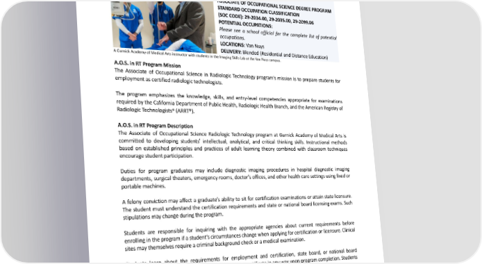 ASSOCIATEOFOCCUPATIONALSCIENCEINRADIOLOGICTECHNOLOGYPROGRAM(A.O.S. INRT) 94WEEKS 2,923CLOCKHOURS 157.5QUARTERCREDITHOURS ASSOCIATEOFOCCUPATIONALSCIENCEDEGREEPROGRAM STANDARDOCCUPATIONCLASSIFICATION (SOCCODE):29-2034.00,29-2035.00,29-2099.06 POTENTIALOCCUPATIONS: Please see a school official for the complete list of potential occupations. LOCATIONS:VanNuys DELIVERY:Blended(ResidentialandDistanceEducation) AGurnickAcademyofMedicalArtsinstructorwithstudentsintheImagingSkillsLabattheVanNuyscampus. A.O.S. in RT Program Mission The Associate of Occupational Science in Radiologic Technology program’s mission is to prepare students for employmentascertifiedradiologictechnologists. The program emphasizes the knowledge, skills, and entry-level competencies appropriate for examinations required by the California Department of Public Health, Radiologic Health Branch, and the American Registry of Radiologic Technologists® (ARRT®). A.O.S. in RT Program Description The Associate of Occupational Science Radiologic Technology program at Gurnick Academy of Medical Arts is committed to developing students’ intellectual, analytical, and critical thinking skills. Instructional methods based on established principles and practices of adult learning theory combined with classroom techniques encouragestudentparticipation. Duties for program graduates may include diagnostic imaging procedures in hospital diagnostic imaging departments, surgical theaters, emergency rooms, doctor’s offices, and other health care settings using fixed or portable machines. A felony conviction may affect a graduate’s ability to sit for certification examinations or attain state licensure. The student must understand the certification requirements and state or national board licensing exams. Such stipulations may change during the program. Students are responsible for inquiring with the appropriate agencies about current requirements before enrolling in the program if a student’s circumstances change when applying for certification or licensure. Clinical sites may themselves require a criminal background check or a medical examination. Students learn about the requirements for employment and certification, state board, or national board licensing exams. No student automatically receives a certificate in any way upon program completion. Students with felony convictions may not be eligible for certification. This program prepares graduates to pursue entry-level employment in the field or related fields. These specific job titles may not correspond directly with the program title. Although Gurnick Academy of Medical Arts will assist students with job placement, finding a job is their responsibility. Gurnick Academy of Medical Arts does not guarantee student placement in any of the described 177