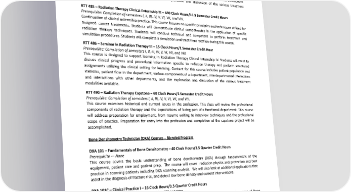 RTT476–SeminarinRadiationTherapyII–15ClockHours/1SemesterCreditHour Prerequisite: Completion of semesters I, II, III, IV, V, and VI. This course is designed to support learning in Radiation Therapy Clinical Internship II. Students will meet to discuss clinical progress and procedural information specific to radiation therapy and perform structured assignments utilizing the clinical setting for learning. Content for this course includes patient population and statistics, patient flow in the department, various components of a department, interdepartmental interactions and interactions with other departments, and the exploration and discussion of the various treatment modalities available. RTT485–RadiationTherapyClinicalExternshipIII–480ClockHours/10.5SemesterCreditHours Prerequisite: Completion of semesters I, II, III, IV, V, VI, VII, and VIII. Continuation of clinical externship practice. This course focuses on specific principles and techniques utilized for assigned cancer treatments. Students will demonstrate clinical competencies in the application of specific radiation therapy techniques. Students will conduct technical and competent to perform treatment and simulation procedures. Students will complete a simulation and treatment rotation during this course. RTT486–SeminarinRadiationTherapyIII–15ClockHours/1SemesterCreditHour Prerequisite: Completion of semesters I, II, III, IV, V, VI, VII, and VIII. This course is designed to support learning in Radiation Therapy Clinical Internship IV. Students will meet to discuss clinical progress and procedural information specific to radiation therapy and perform structured assignments utilizing the clinical setting for learning. Content for this course includes patient population and statistics, patient flow in the department, various components of a department, interdepartmental interactions and interactions with other departments, and the exploration and discussion of the various treatment modalities available. RTT490–RadiationTherapyCapstone–60ClockHours/4SemesterCreditHours Prerequisite: Completion of semesters I, II, III, IV, V, VI, VII, and VIII. This course examines historical and current issues in the profession. This class will review the professional components of radiation therapy and the expectations of being part of a functional department. This course will address preparation for employment, from resume writing to interview techniques and the professional scope of practice. Preparation for entry into the profession and completion of the capstone project will be accomplished. BoneDensitometryTechnician(DXA)Courses–BlendedProgram DXA101–FundamentalsofBoneDensitometry–40ClockHours/3.5QuarterCreditHours Prerequisite — None This course covers the basic understanding of bone densitometry (DXA) through fundamentals of the equipment, patient care and patient prep. The course will cover radiation physics and protection and best practice in scanning patients including DXA scanning analysis. We will also look at additional applications that assist in the diagnosis of fracture risk, and detect low bone density and current Interventions. DXA101C–ClinicalPracticeI–16ClockHours/0.5QuarterCreditHours Prerequisite: Completion of DXA 101 with a “C” or better. Clinical experiences are designed to provide patient care and assessment, competent performance of Bone Density imaging, and total quality management. The concepts of team practice, patient-centered clinical practice, and professional development are evaluated through structured, competency-based clinical education. Levels of competency ensure the well-being of the patient prior to, during, and following the radiologic procedure. DentalAssistant (DA) Courses – Blended Program 304