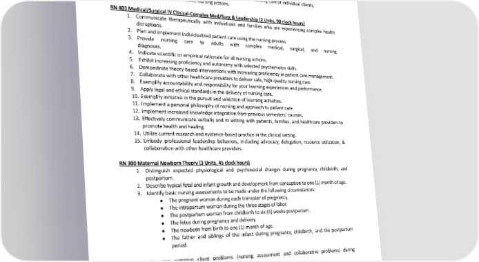 3. Apply critical thinking and develop priority in nursing approaches to patients with complex medical or surgical conditions in various states of diagnosis and treatment. 4. Explain the scientific rationale for selected nursing interventions. 5. Determinetheimportanceofnursingleadershipinthehealthcaresystem 6. Critically examine selected nursing practices: a. Adaptnursingpracticestotheageanddevelopmentalstageoftheadult. b. Relate selected nursing research findings to the nursing care of individual clients. c. Analyze alternative nursing actions. RN403Medical/SurgicalIVClinical-ComplexMed/Surg&Leadership(2Units,90clockhours) 1. Communicate therapeutically with individuals and families who are experiencing complex health disruptions. 2. Plan and implementindividualized patient care using the nursing process. 3. Provide nursing care to adults with complex medical, surgical, and nursing diagnoses. 4. Indicate scientific or empirical rationale for all nursing actions. 5. Exhibit increasing proficiency and autonomy with selected psychomotor skills. 6. Demonstratetheory-basedinterventionswithincreasingproficiencyinpatientcaremanagement. 7. Collaborate with other healthcare providers to deliver safe, high-quality nursing care. 8. Exemplify accountability and responsibility for your learning experiences and performance. 9. Applylegal and ethical standards in the delivery of nursing care. 10. Exemplify initiative in the pursuit and selection of learning activities. 11. Implementapersonalphilosophyofnursingandapproachtopatientcare. 12. Implementincreasedknowledgeintegrationfromprevioussemesters’courses. 13. Effectively communicate verbally and in writing with patients, families, and healthcare providers to promotehealthandhealing. 14. Utilize current research and evidence-based practice in the clinical setting. 15. Embody professional leadership behaviors, including advocacy, delegation, resource utilization, & collaboration with other healthcare providers. RN300MaternalNewbornTheory(3Units,45clockhours) 1. Distinguish expected physiological and psychosocial changes during pregnancy, childbirth, and postpartum. 2. Describe typical fetal and infant growth and development from conception to one (1) month of age. 3. Identify basic nursing assessments to be made under the following circumstances: ● Thepregnantwomanduringeachtrimesterofpregnancy. ● Theintrapartumwomanduringthethreestagesoflabor. ● Thepostpartumwomanfromchildbirthtosix(6)weekspostpartum. ● Thefetusduringpregnancyanddelivery. ● Thenewbornfrombirthtoone(1)monthofage. ● The father and siblings of the infant during pregnancy, childbirth, and the postpartum period. 4. Examine common client problems (nursing assessment and collaborative problems) during pregnancy, childbirth, and postpartum. 5. State major learning needs and teaching strategies for educating women and their families during pregnancy, childbirth, and postpartum. 6. Describe selected complications during pregnancy, childbirth, and postpartum. Identify critical nursing assessments and interventions for preventing, detecting, and treating complications. 7. Determine critical nursing assessments and interventions for detecting and preventing newborn complications. 242