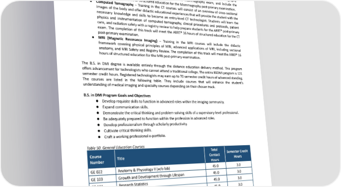 ● Leadership and Management – Training in the Leadership and Management courses will prepare thestudentforhealthcareadministrationandmanagementpositions. ● Education – Training in the Education courses will prepare the student for a career in imaging education (depending on minimumcourseenrollment). ● Mammography – Training in the Mammography courses will include all MQSA-mandated material and an emphasis on mammography registry review. This track will cover all ARRT® mammography exam content specifications, review the California state mammography exam, and include the required ARRT®16hoursofstructurededucationfortheMammographypost-primaryexamination. ● Computed Tomography – Training in the CT courses will consist of an overview of cross-sectional images of the body and offer didactic educational experiences that will provide the student with the necessary knowledge and skills to become an entry-level CT technologist. Students will learn the physics and instrumentation of computed tomography, clinical procedures and protocols, patient care, and radiation safety with a registry review to help prepare students for the ARRT® post-primary exam. The completion of this track will meet the ARRT® 16 hours of structured education for the CT post-primary examination. ● MRI (Magnetic Resonance Imaging) – Training in the MRI courses will include the didactic framework covering physical principles of MRI, advanced applications of MRI, including sectional anatomy, and MRI Safety and Registry Review. The completion of this track will meet the ARRT® 16 hoursofstructurededucationfortheMRIpost-primaryexamination. The B.S. in DMI degree is available entirely through the distance education delivery method. This program offers advancement for technologists who cannot attend a traditional college. The entire BSDMI program is 121 semester credit hours. Registered technologists may earn up to 70 semester credit hours of advanced standing. The courses are listed in the following table. They include courses that will enhance the student’s understandingofmedicalimagingandspecialtycoursesdependingontheirchosentrack. B.S. in DMI Program Goals and Objectives ● Developrequisiteskillstofunctioninadvancedroleswithintheimagingcommunity. ● Expandcommunicationskills. ● Demonstratethecriticalthinkingandproblem-solvingskillsofasupervisory-levelprofessional. ● Beadequatelypreparedtofunctionwithintheprofessioninadvancedroles. ● Developprofessionalismthroughscholarlyproductivity. ● Cultivatecritical thinking skills. ● Craftaworkingprofessionale-portfolio. Table 50. General Education Courses Total Course SemesterCredit Title Contact Number Hours Hours GE022 Anatomy&PhysiologyII(w/olab) 45.0 3.0 GE103 GrowthandDevelopmentthroughLifespan 45.0 3.0 GE111 ResearchStatistics 45.0 3.0 GE120 Introduction to Information Systems 45.0 3.0 GE202 GeneralPsychology 45.0 3.0 GE221 Written CommunicationforProfessionals 45.0 3.0 GE240 Public Speaking 45.0 3.0 TOTAL 315.0 21.0 207
