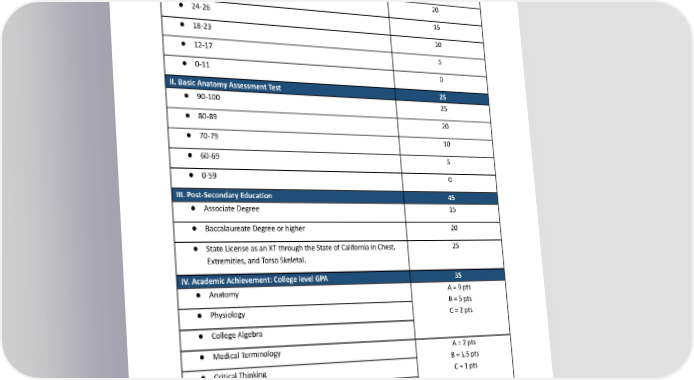 Table 13. A.S. in RT Admission Point System Points Category: Possible Points I. CCAT 25 25 ● 32orGreater 20 ● 27-31 15 ● 24-26 10 ● 18-23 5 ● 12-17 0 ● 0-11 II. Basic Anatomy Assessment Test 25 25 ● 90-100 20 ● 80-89 10 ● 70-79 5 ● 60-69 0 ● 0-59 III. Post-Secondary Education 45 15 ● AssociateDegree 20 ● BaccalaureateDegreeorhigher 25 ● StateLicenseasanXTthroughtheStateofCaliforniainChest, Extremities, and Torso Skeletal. IV. Academic Achievement: College level GPA 35 A=9pts ● Anatomy B=5pts ● Physiology C=2pts ● CollegeAlgebra A=2pts ● MedicalTerminology B=1.5pts ● Critical Thinking C=1pts ● English ● Sociology If the course was taken more than twice (to include drop/withdrawal), the points would not be counted. V. One-PageResume(required) 15 VI. Essay – One-page, APA Format 20 44