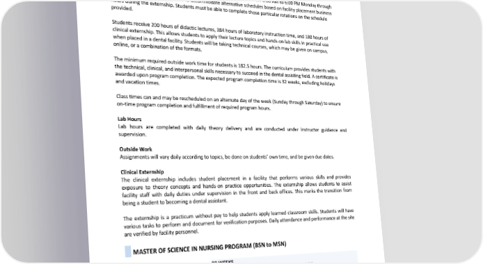 Theprogramcomprisesseven(7)didactic/laboratorycoursesinfour-weekblocks.DA100-Infectioncontrolis taught before the students start any other courses. After completing the DA-100 course, students will take and completeallothercourses.DA200-202,andDA202-205aretaughtinsequencedependingonthequarterof thestart. Students must complete all didactic/laboratory courses before starting the DA 300 Externship course. Students must be available for didactic and laboratory coursework from 8:00 AM to 6:00 PM Monday through Friday. Students may be required to accommodate alternative schedules based on facility placement business hoursduringtheexternship.Studentsmustbeabletocompletethoseparticularrotationsontheschedule provided. Students receive 200 hours of didactic lectures, 384 hours of laboratory instruction time, and 180 hours of clinical externship. This allows students to apply their lecture topics and hands-on lab skills in practical use whenplacedinadentalfacility.Studentswillbetakingtechnicalcourses,whichmaybegivenoncampus, online, or a combination of the formats. Theminimumrequiredoutsideworktimeforstudentsis182.5hours.Thecurriculumprovidesstudentswith thetechnical, clinical, and interpersonal skills necessary to succeed in the dental assisting field. A certificate is awardeduponprogramcompletion.Theexpectedprogramcompletiontimeis32weeks,excludingholidays andvacationtimes. Class times can and may be rescheduled on an alternate day of the week (Sunday through Saturday) to ensure on-timeprogramcompletionandfulfillmentofrequiredprogramhours. LabHours Lab hours are completed with daily theory delivery and are conducted under instructor guidance and supervision. OutsideWork Assignmentswill vary daily according to topics, be done on students’ own time, and be given due dates. Clinical Externship The clinical externship includes student placement in a facility that performs various skills and provides exposure to theory concepts and hands-on practice opportunities. The externship allows students to assist facility staff with daily duties under supervision in the front and back offices. This marks the transition from being a student to becoming a dental assistant. The externship is a practicum without pay to help students apply learned classroom skills. Students will have various tasks to perform and document for verification purposes. Daily attendance and performance at the site are verified by facility personnel. MASTEROFSCIENCEINNURSINGPROGRAM(BSNtoMSN) 90WEEKS 36SEMESTERCREDITHOURS;540CLOCKHOURS 6SEMESTERS STANDARDOCCUPATIONALCLASSIFICATION (SOCCode):29-1141.00.29-1151.00,29-1161.01,29-1171.00 POTENTIAL OCCUPATIONS: Please see a school official for the complete list of potential occupations. LOCATIONS:Concord 224