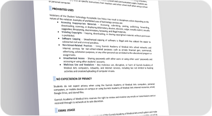Students mayfacedisciplinary action if applications are not installed or intentionally removed. ACCEPTABLEUSES The Gurnick Academy of Medical Arts computers and Internet services are provided for educational purposes and study consistent with its educational mission, curriculum, and instructional goals. When using computers, all policies, school rules, and expectations concerning student conduct and communications apply. Students are also expected to comply with all specific instructions from teachers and other school staff when using a school or personal computer. PROHIBITEDUSES Violations of the Student Technology Acceptable Use Policy may result in disciplinary action depending on the nature of the violation. Examples of prohibited uses of technology services are: ● Accessing Inappropriate Materials – Accessing, submitting, posting, publishing, forwarding, downloading, scanning, or displaying defamatory, abusive, obscene, vulgar, sexually explicit, sexually suggestive, threatening, discriminatory, harassing, and illegal materials. ● Violating Copyrights – Copying, downloading, or sharing copyrighted materials without permission is prohibited. ● Software Copying – Unauthorized copying of software is illegal and may subject the copier to substantial civil and criminal penalties. ● Non-School-Related Practices – Using Gurnick Academy of Medical Arts school networks and Internet services for non-school-related purposes such as private financial gain, commercial, advertising, solicitation purposes, or any other personal use unrelated to the educational program or assignments. ● Unauthorized Access – Sharing passwords with other users or using other users’ passwords and accessing or using other students’ accounts. ● Malicious Use and Vandalism – Any malicious use, disruption, or harm of Gurnick Academy of Medical Arts computers, networks, and Internet services, including but not limited to hacking activities and creation/uploading of computer viruses. NOEXPECTATIONOFPRIVACY Students do not expect privacy when using the Gurnick Academy of Medical Arts computers, personal computers, or mobile devices on campus or using Gurnick Academy of Medical Arts internet resources, email, GoogleDrive,andstoredfiles. Gurnick Academy of Medical Arts reserves the right to review and monitor any emails or transmissions sent or received through its network at its sole discretion. EMAILUSAGE This information aims to ensure the proper use of the Gurnick Academy of Medical Arts email system and make users aware of what Gurnick Academy of Medical Arts deems to be acceptable and unacceptable use of its email system. Gurnick Academy of Medical Arts reserves the right to amend this policy. Concerning amendments,userswillbeinformedappropriately. SystemMonitoring You have no expectation of privacy for anything you create, store, send, or receive on the Gurnick Academy of Medical Arts computer system. Your emails can be monitored without prior notification if Gurnick Academy of 164