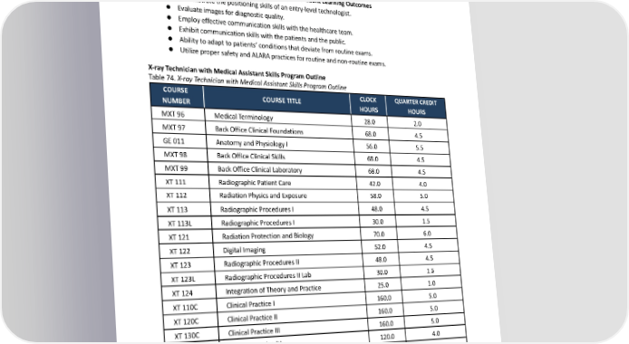 ● Graduatestudentswiththeclinicalcompetencerequiredtobeentry-leveltechnologists. ● Produce students who will demonstrate effective interpersonal skills with the entire healthcare teamandthepublic. ● Enable students to employ appropriate critical thinking and problem-solving skills to be entry-level technologists in the clinical setting. X-ray Technician with Medical Assistant Skills Program Student Learning Outcomes ● Demonstratethepositioningskillsofanentry-leveltechnologist. ● Evaluateimagesfordiagnosticquality. ● Employeffectivecommunicationskillswiththehealthcareteam. ● Exhibitcommunicationskillswiththepatientsandthepublic. ● Abilitytoadapttopatients’conditionsthatdeviatefromroutineexams. ● UtilizepropersafetyandALARApracticesforroutineandnon-routineexams. X-ray Technician with Medical Assistant Skills Program Outline Table 74. X-ray Technician with Medical Assistant Skills Program Outline COURSE CLOCK QUARTERCREDIT COURSETITLE NUMBER HOURS HOURS MXT96 MedicalTerminology 28.0 2.0 MXT97 BackOfficeClinical Foundations 68.0 4.5 GE011 AnatomyandPhysiologyI 56.0 5.5 MXT98 BackOfficeClinical Skills 68.0 4.5 MXT99 BackOfficeClinical Laboratory 68.0 4.5 XT111 Radiographic Patient Care 42.0 4.0 XT112 Radiation Physics and Exposure 58.0 5.0 XT113 Radiographic Procedures I 48.0 4.5 XT113L Radiographic Procedures I 30.0 1.5 XT121 Radiation Protection and Biology 70.0 6.0 XT122 Digital Imaging 52.0 4.5 XT123 Radiographic Procedures II 48.0 4.5 XT123L Radiographic Procedures II Lab 30.0 1.5 XT124 Integration of Theory and Practice 25.0 1.0 XT110C Clinical Practice I 160.0 5.0 XT120C Clinical Practice II 160.0 5.0 XT130C Clinical Practice III 160.0 5.0 XT140C Clinical Practice IV 120.0 4.0 XT150 RadiographySeminar 50.0 5.0 TOTAL 1,341.0 77.5 X-ray Technician with Medical Assistant Skills Program Information, Length, and Schedule The program information, length, and schedule may change. Read the accompanying Addendum for changes andupdates,andconnectwithanAdmissionAdvisorformoredetails. 233