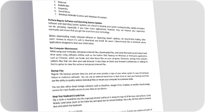 COMPUTERBESTPRACTICES UseAntivirusSoftware Antivirus software is a software utility that detects, prevents, and removes viruses, worms, and other malicious software from the computer. Antivirus programs are essential utilities for any computer. We strongly recommendusingoneofthefollowingAntivirusapplications: 1. Symantec 2. McAfee 3. Webroot 4. Bitdefender 5. Kaspersky 6. TrendMicro 7. WindowsDefender(ComeswithWindowsOSsystem) PerformRegularSoftwareandOperatingSystemUpdates Software and Operating System updates are critical to keeping your system running healthy. Update reminders can be annoying, especially if you have many applications; however, they can improve your experience eventually and ensure that you get the most from your technology. Before downloading newly released software or Operating System updates, we recommend reading other users’ reviews to ensure it’s safe to download and install. Be aware. Cybercriminals like to distribute phony applications designed to steal your information. RunComputerMaintenance Whileusingyourcomputer,temporaryinternetfiles,downloadedfiles,andcachefilesbuildupandreducehard drive space using software utilities such as the built-in Disk Cleanup for Windows or third-party applications such as CCleaner, which can locate and clear these files on your computer. Moreover, visiting many websites collects files that can slow your web browser. It also helps to check your browser’s preferences or settings to find its option to clear the cache or temporary internet files. BackupFiles Regular file backups prevent data loss and can even provide a copy of your entire system in case of hardware failure or malicious software. You can use an external hard drive or flash drive to save your backups and then usetheutility to quickly restore individual files or return your computer to a previous state. You can also utilize cloud storage solutions such as OneDrive, Google Drive, Dropbox, or another cloud storage service for more flexible access to your data on any device. KeepYourKeyboardCrumbFree Dip a cloth or towelette into the isopropyl alcohol and brush it along the tops of all the keys and surfaces. Scrub heavily used areas (such as the Enter key and space bar) to remove buildup. Use a dry, lint-free cloth to remove dust and polish the keyboard. AvoidExtremeTemperatures Computers get warm after a while, and some can get hot. The temperature changes are routine and part of cooling the laptop. However, be aware that if your computer gets hot, it could be an overheating sign, which canpotentially cause damage. Do not leave your computer in a hot car or direct sunlight. UseAProtectiveCase Whencarryingalaptopormovingyourcomputer,useaprotectivecaseorbagtoprotectitfromdamage. 168