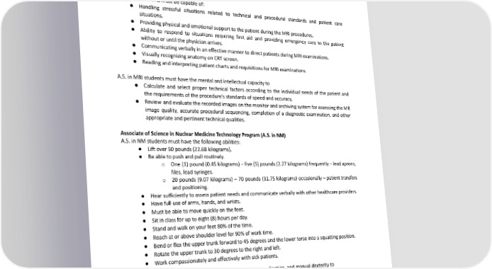● Standandwalkonyourfeet80%ofthetime. ● Workcompassionatelyandeffectivelywithillpatients. A.S. in MRI students must have sufficient strength, motor coordination, and manual dexterity to ● Transport,lift, and transfer patients from a wheelchair or cart to a table or bed. ● Move,adjust,andmanipulatevariousMRIequipment. A.S. in MRI students must be capable of: ● Handling stressful situations related to technical and procedural standards and patient care situations. ● ProvidingphysicalandemotionalsupporttothepatientduringtheMRIprocedures. ● Ability to respond to situations requiring first aid and providing emergency care to the patient withoutoruntilthephysicianarrives. ● CommunicatingverballyinaneffectivemannertodirectpatientsduringMRIexaminations. ● VisuallyrecognizinganatomyonCRTscreen. ● ReadingandinterpretingpatientchartsandrequisitionsforMRIexaminations. A.S. in MRI students must have the mental and intellectual capacity to ● Calculate and select proper technical factors according to the individual needs of the patient and therequirementsoftheprocedure’sstandardsofspeedandaccuracy. ● Review andevaluatetherecordedimagesonthemonitorandarchivingsystemforassessingtheMR image quality, accurate procedural sequencing, completion of a diagnostic examination, and other appropriate and pertinent technical qualities. Associate of Science in Nuclear Medicine Technology Program (A.S. in NM) A.S. in NM students must have the following abilities: ● Liftover50pounds(22.68kilograms). ● Beabletopushandpullroutinely. o One(1)pound(0.45kilograms)–five(5)pounds(2.27kilograms)frequently–leadaprons, files, lead syringes. o 20pounds(9.07 kilograms) – 70 pounds (31.75 kilograms) occasionally – patient transfers andpositioning. ● Hearsufficientlytoassesspatientneedsandcommunicateverballywithotherhealthcareproviders. ● Havefulluseofarms,hands,andwrists. ● Mustbeabletomovequicklyonthefeet. ● Sitinclassforuptoeight(8)hoursperday. ● Standandwalkonyourfeet80%ofthetime. ● Reachatoraboveshoulderlevelfor90%ofworktime. ● Bendorflextheuppertrunkforwardto45degreesandthelowertorsointoasquattingposition. ● Rotatetheuppertrunkto30degreestotherightandleft. ● Workcompassionatelyandeffectivelywithsickpatients. A.S. in NM students must have sufficient strength, motor coordination, and manual dexterity to ● Transport,lift, and transfer patients from a wheelchair or cart to an imaging table or bed. ● Move, adjust, and manipulate various radiographic equipment, including portables and C-arm equipmentphysicaltransportation. ● Completepatientexaminationsperestablishedpoliciesandprocedureswithspeedandaccuracy. A.S. in NM students must also be capable of: ● Handlestressfulsituationsrelatedtotechnicalandproceduralstandardsandpatientcaresituations. 64