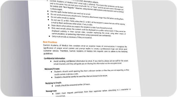 ● Distributingmaterialsinviolation of copyright law. ● Usingemailservicesforcommercialactivitiesorprofit-makingpurposes. ● Using email servicestovisit, view, or distribute internet sites or content containing obscene, sexually explicit, or profane material. ● Sendingorclickingonmaliciousemaillinks. Writing Emails ● Writewell-structuredemailsanduseshort,descriptivesubjects. ● Gurnick Academy of Medical Arts’ email style is informal. This means that sentences can be short and to the point. You can start your email with “Hi,” or “Dear,” and the person’s name. Messages can be ended with “Best Regards.” However, using Internet abbreviations and characters such as smileys is discouraged. ● Usethespellcheckerbeforeyousendoutanemail. ● Donotsendunnecessaryattachments.Compressattachmentslargerthan2Mbeforesendingthem. ● Donotwriteemailsincapitals. ● DonotuseCC:orBCC:fieldsunlesstheCC:orBCC:oftherecipientisawarethatyouwillbecopying amailtothemandknowswhataction,ifany,totake. ● Stateclearlywhatactionyouexpecttherecipienttotakeifyouforwardanemail. ● Only send emails where the content could be displayed on a public notice board. If they cannot be displayed publicly in their current state, consider rephrasing the email, using other means of communication,orprotectinginformationusingapassword(seeconfidential). ● Onlymarkemailsasnecessaryiftheyareessential. Best Practices Gurnick Academy of Medical Arts considers email an essential means of communication. It recognizes the significance of proper email content and prompt replies to convey a professional image and deliver good customer service. Therefore, Gurnick Academy of Medical Arts requests users to adhere to the following guidelines: Confidential Information ● Avoid sending confidential information by email. If you need to, please ask our staff for the secure email channel, and they will guide you on sharing this information via the encrypted email. Malware/Viruses ● Students should avoid opening files from unknown senders or files they are not expecting, as they could contain malicious code. ● Studentsshouldbecarefultosendfilesthatareknowntobesecure. Replying to Emails ● Emailsshouldbeansweredwithin24hours. Newsgroups ● Users must request permission from their supervisor before subscribing to a newsletter or newsgroup. Maintenance ● Delete any email messages you do not need to archive and set your email client to empty your “deleted items” upon closing. 166