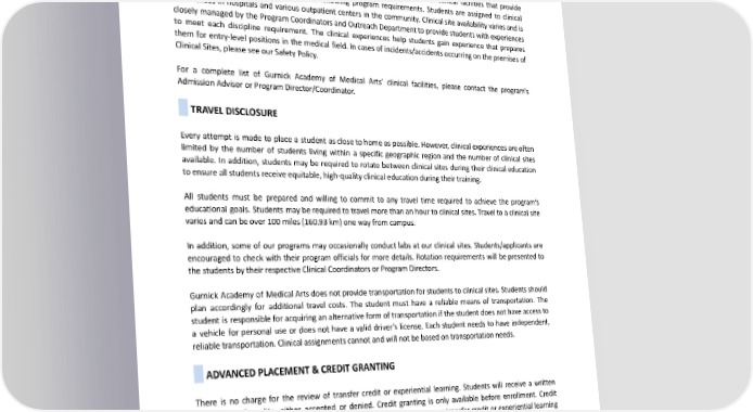 student’s ability to attend the clinical facility, complete the program’s graduation requirements, or obtain certification after completion. CLINICALFACILITIES Gurnick Academy of Medical Arts has entered into affiliation agreements with clinical facilities that provide students with experiences in many areas following program requirements. Students are assigned to clinical experiences in hospitals and various outpatient centers in the community. Clinical site availability varies and is closely managed by the Program Coordinators and Outreach Department to provide students with experiences to meet each discipline requirement. The clinical experiences help students gain experience that prepares them for entry-level positions in the medical field. In cases of incidents/accidents occurring on the premises of Clinical Sites, please see our Safety Policy. For a complete list of Gurnick Academy of Medical Arts’ clinical facilities, please contact the program’s AdmissionAdvisororProgramDirector/Coordinator. TRAVELDISCLOSURE Every attempt is made to place a student as close to home as possible. However, clinical experiences are often limited by the number of students living within a specific geographic region and the number of clinical sites available. In addition, students may be required to rotate between clinical sites during their clinical education to ensure all students receive equitable, high-quality clinical education during their training. All students must be prepared and willing to commit to any travel time required to achieve the program’s educational goals. Students may be required to travel more than an hour to clinical sites. Travel to a clinical site varies and can be over 100 miles (160.93 km) one way from campus. In addition, some of our programs may occasionally conduct labs at our clinical sites. Students/applicants are encouraged to check with their program officials for more details. Rotation requirements will be presented to thestudentsbytheirrespectiveClinical Coordinators or Program Directors. Gurnick Academy of MedicalArtsdoesnotprovidetransportationforstudentstoclinicalsites. Students should plan accordingly for additional travel costs. The student must have a reliable means of transportation. The student is responsible for acquiring an alternative form of transportation if the student does not have access to a vehicle for personal use or does not have a valid driver’s license. Each student needs to have independent, reliable transportation. Clinical assignments cannot and will not be based on transportation needs. ADVANCEDPLACEMENT&CREDITGRANTING There is no charge for the review of transfer credit or experiential learning. Students will receive a written evaluation of credits, either accepted or denied. Credit granting is only available before enrollment. Credit granting will not be evaluated once a student is enrolled. All decisions on transfer credit or experiential learning are final; appeals are not accepted. Students can be granted credit up to 49% of the total hours in certificate and diploma programs and up to 75% of the total hours in degree programs. Credit Granting will be awarded according to program, state, and academy policies. Transfer credits for General Education courses may be granted regardless of when they are completed. Transfer credit towards a certain program, experiential learning, challenge examinations, and 75