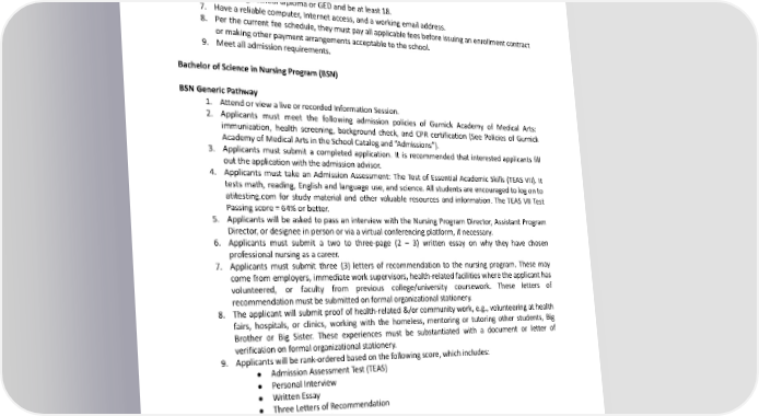 Sonography, Cardiovascular Sonography, MRI, or Radiation Therapy (credit granted for a combinationofpastcorecourseworkandregistryorequivalent=54-semestercredits.) 2. Have completed 16 semester credits of General Education courses that are not a part of the B.S. in DMIProgram. 3. Proof of credentialing certification. 4. Submitofficial transcripts. 5. Completeanapplicationforadmission. 6. HaveahighschooldiplomaorGEDandbeatleast18. 7. Haveareliablecomputer,Internetaccess,andaworkingemailaddress. 8. Per the current fee schedule, they must pay all applicable fees before issuing an enrollment contract or making other payment arrangements acceptable to the school. 9. Meetalladmissionrequirements. BachelorofScienceinNursingProgram(BSN) BSNGenericPathway 1. AttendorviewaliveorrecordedInformationSession. 2. Applicants must meet the following admission policies of Gurnick Academy of Medical Arts: immunization, health screening, background check, and CPR certification (See Policies of Gurnick AcademyofMedicalArtsintheSchoolCatalogand“Admissions”). 3. Applicants must submit a completed application. It is recommended that interested applicants fill outtheapplicationwiththeadmissionadvisor. 4. Applicants must take an Admission Assessment: The Test of Essential Academic Skills (TEAS VII). It tests math, reading, English and language use, and science. All students are encouraged to log on to atitesting.com for study material and other valuable resources and information. The TEAS VII Test Passing score = 64% or better. 5. Applicants will be asked to pass an interview with the Nursing Program Director, Assistant Program Director, or designee in person or via a virtual conferencing platform, if necessary. 6. Applicants must submit a two to three-page (2 – 3) written essay on why they have chosen professional nursing as a career. 7. Applicants must submit three (3) letters of recommendation to the nursing program. These may come from employers, immediateworksupervisors,health-relatedfacilities where the applicant has volunteered, or faculty from previous college/university coursework. These letters of recommendationmustbesubmittedonformalorganizationalstationery. 8. The applicant will submit proof of health-related &/or community work, e.g., volunteering at health fairs, hospitals, or clinics, working with the homeless, mentoring or tutoring other students, Big Brother or Big Sister. These experiences must be substantiated with a document or letter of verification on formal organizational stationery. 9. Applicants will be rank-ordered based on the following score, which includes: ● AdmissionAssessmentTest(TEAS) ● PersonalInterview ● WrittenEssay ● ThreeLettersofRecommendation ● CommunityWork ● Health-RelatedExperience LVNtoBSNPathway 1. Applicants must attend an Information Session. 2. Applicants must meet the following admission policies of Gurnick Academy of Medical Arts: immunization, health screening, background check, and CPR certification (See Policies of Gurnick AcademyofMedicalArtsintheSchoolCatalogand“Admissions”). 46