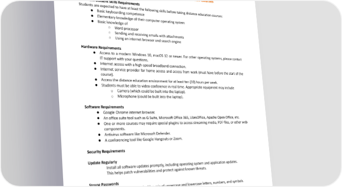 ● PersonalInterview ● WrittenEssay ● Three(3)LettersofRecommendation ** If enrollment openings are fewer than applicants that meet the admission requirements, applicants will be askedtopassaninterviewwiththeNursingProgramDirectororAssociateProgramDirector. MinimumRequirementsforStudentsEnrollinginDistanceEducationCourses MinimumStudentSkillsRequirements Students are expected to have at least the following skills before taking distance education courses: ● Basickeyboardingcompetence ● Elementaryknowledgeoftheircomputeroperatingsystem ● Basicknowledgeof ○ Wordprocessor ○ Sendingandreceivingemailswithattachments ○ Usinganinternetbrowserandsearchengine HardwareRequirements ● Access to a modern Windows 10, macOS 12 or newer. For other operating systems,pleasecontact IT support with your questions. ● Internetaccesswithahigh-speedbroadbandconnection. ● Internet service provider for home access and access from work (must have before the start of the course). ● Accessthedistanceeducationenvironmentforatleastten(10)hoursperweek. ● Studentsmustbeabletovideoconferenceinrealtime.Appropriateequipmentmayinclude o Camera(whichcouldbebuiltintothelaptop). o Microphone(couldbebuiltintothelaptop). SoftwareRequirements ● GoogleChromeinternetbrowser. ● AnofficesuitetoolsuchasGSuite,MicrosoftOffice365,LibreOffice,ApacheOpenOffice,etc. ● Oneormorecoursesmayrequirespecialpluginstoaccessstreamingmedia,PDFfiles,orotherweb components. ● AntivirussoftwarelikeMicrosoftDefender. ● AconferencingtoollikeGoogleHangoutsorZoom. Security Requirements UpdateRegularly Install all software updates promptly, including operating system and application updates. This helps patch vulnerabilities and protect against known threats. Strong Passwords Useastrongpasswordwithamixofuppercaseandlowercaseletters,numbers,andsymbols. Avoidusingeasily guessable information like your name, birthday, or pet’s name. Enabletwo-factor authentication for an extra layer of security where possible. Virus and MalwareScans Regularly scan your computer for viruses and malware using a reputable antivirus program. Updateyourantivirusprogramregularlytoensureitseffectiveness. 58