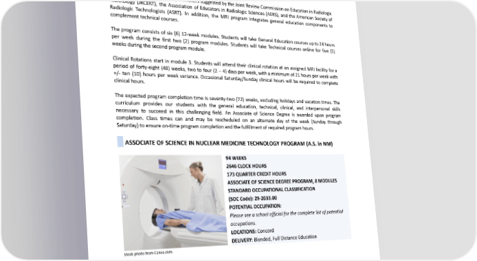 lectures and 1:1 or 1:2 during clinical experiences. The MRI program comprises seventy-two (72) weeks of full-time study. The program is offered twice per calendar year. The curriculum encompasses all magnetic resonance imaging technology principles, including 246 hours of general education instruction, 620 hours of technical didactic instruction, and 1,020 hours of supervised clinical experience. The program is based on the parameters suggested by the Joint Review Commission on Education in Radiologic Technology (JRCERT), the Association of Educators in Radiologic Sciences (AERS), and the American Society of Radiologic Technologists (ASRT). In addition, the MRI program integrates general education components to complementtechnicalcourses. The program consists of six (6) 12-week modules. Students will take General Education courses up to 24 hours per week during the first two (2) program modules. Students will take Technical courses online for five (5) weeksduringthesecondprogrammodule. Clinical Rotations start in module 3. Students will attend their clinical rotation at an assigned MRI facility for a period of forty-eight (48) weeks, two to four (2 – 4) days per week, with a minimum of 21 hours per week with +/- ten (10) hours per week variance. Occasional Saturday/Sunday clinical hours will be required to complete clinical hours. The expected program completion time is seventy-two (72) weeks, excluding holidays and vacation times. The curriculum provides our students with the general education, technical, clinical, and interpersonal skills necessary to succeed in this challenging field. An Associate of Science Degree is awarded upon program completion. Class times can and may be rescheduled on an alternate day of the week (Sunday through Saturday) to ensure on-time program completion and the fulfillment of required program hours. ASSOCIATEOFSCIENCEINNUCLEARMEDICINETECHNOLOGYPROGRAM(A.S.inNM) 94WEEKS 2646CLOCKHOURS 173QUARTERCREDITHOURS ASSOCIATEOFSCIENCEDEGREEPROGRAM,8MODULES STANDARDOCCUPATIONALCLASSIFICATION (SOCCode):29-2033.00 POTENTIALOCCUPATION: Please see a school official for the complete list of potential occupations. LOCATIONS:Concord DELIVERY:Blended,FullDistanceEducation Stock photo from Canva.com. A.S. in NM ProgramMission Gurnick AcademyofMedicalArtsaimstoofferqualityalliedhealthandnursingprogramsthatintegrate professional skills, career-focused education, and hands-on practical experience by empowering students to developandachievetheirpersonalandcareergoals. TheNuclearMedicineTechnologyprogram’smissionistoprovidethehealthcarecommunitywith compassionate,competent,andprofessionalnuclearmedicinetechnologists. 189