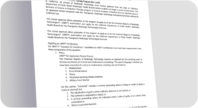 https://www.cdph.ca.gov/Programs/CEH/DRSEM/Pages/RHB-Contact.aspx. The law requires that radiologic technologists be licensed to practice as radiographers. Completing the Associate of Science in Radiologic Technology program at Gurnick Academy of Medical Arts may not automatically qualify the graduate to apply for the ARRT® examination. Some employers might require the radiologic technologist to have an ARRT® certification in addition to the State of California certification. BachelorofScienceinRadiationTherapyProgram(B.S.inRT) In California, all schools of Radiologic Technology must receive approval from the State of California Department of Public Health Radiologic Health Branch before students can begin a course of instruction. The Bachelor of Science in Radiation Therapy program at Gurnick Academy of Medical Arts has obtained status as an approved school compliant with the Therapeutic Radiologic Technology instructional practices defined by California law. This school approval allows graduates of the program to apply to sit for the American Registry of Radiologic Technologists® (ARRT®) examination and apply for the California Department of Public Health, Radiologic Health Branch for the Therapeutic Radiologic Technologist licensure. This school approval allows graduates of the program to apply to sit for the American Registry of Radiologic Technologists® (ARRT®) examination and apply for the California Department of Public Health, Radiologic Health Branch for the Therapeutic Radiologic Technologist licensure. Eligibility for ARRT® Certification Per ARRT’s® “Equation for Excellence,” candidates for ARRT® certification must meet basic requirements in the three componentsoftheequation: 1. Ethics ARRT®Pre-ApplicationReviewProcess The American Registry of Radiologic Technology requires an applicant for the certifying exam to disclose any history of criminal and misdemeanor proceedings. The specific language is whether you havebeenconvictedofacrimeormisdemeanor,including,butnotlimitedto. 1. Misdemeanor 2. GrossMisdemeanor 3. Felony 4. All alcohol and drug-related violations 5. Military Court Martial For this section, “Convicted” includes a criminal proceeding where a finding or verdict of guilty is madeorreturned,but 1. Theadjudication of guilt is either withheld, deferred, or not entered; or 2. Thesentenceissuspendedorstayed,or 3. A criminal proceeding where the individual enters a plea of guilty or no contest (nolo contendere) or 4. Thereisapre-trial diversion. You are NOT required to report offenses committed as a juvenile and were adjudicated through the juvenile court system. An applicant with a concern is advised to obtain a pre-application review of eligibility for certification before entering the program. The information can be obtained from the ARRT® by calling (651) 687-0048 or their website at www.arrt.org. 2. Education 89