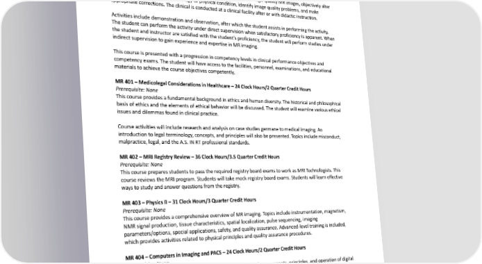 systemsandareas.Thestudentswillusecasestudiesandimagesofthepathologiestoreinforcethelectures fromcasestheyperformedorobservedduringclinicalexternships.Thestudentwillresearchpathologiesand present the research in class. MR311–MRIClinicalIII–252ClockHours/8QuarterCreditHours Prerequisite: None This course allows students to practice the skills necessary to obtain high-quality MR images, objectively alter protocols based on patient pathology or physical condition, identify image quality problems, and make appropriate corrections. The clinical is conducted at a clinical facility after or with didactic instruction. Activities include demonstration and observation, after which the student assists in performing the activity. Thestudentcanperformtheactivityunderdirectsupervisionwhensatisfactoryproficiencyisapparent.When thestudentandinstructoraresatisfied with the student’s proficiency, the student will perform studies under indirect supervision to gain experience and expertise in MR imaging. This course is presented with a progression in competency levels in clinical performance objectives and competencyexams.Thestudentwillhaveaccesstothefacilities,personnel,examinations,andeducational materials to achieve the course objectives competently. MR401–MedicolegalConsiderationsinHealthcare–24ClockHours/2QuarterCreditHours Prerequisite: None This course provides a fundamental background in ethics and human diversity. The historical and philosophical basis of ethics and the elements of ethical behavior will be discussed. The student will examine various ethical issues and dilemmas found in clinical practice. Courseactivities will include research and analysis on case studies germane to medical imaging. An introduction to legal terminology, concepts, and principles will also be presented. Topics include misconduct, malpractice, legal, and the A.S. IN RT professional standards. MR402–MRIRegistryReview–36ClockHours/3.5QuarterCreditHours Prerequisite: None This course prepares students to pass the required registry board exams to work as MRI Technologists. This course reviews the MRI program. Students will take mock registry board exams. Students will learn effective waystostudyandanswerquestionsfromtheregistry. MR403–PhysicsII–31ClockHours/3QuarterCreditHours Prerequisite: None This course provides a comprehensive overview of MR imaging. Topics include instrumentation, magnetism, NMRsignalproduction,tissuecharacteristics, spatial localization, pulse sequencing, imaging parameters/options, special applications, safety, and quality assurance. Advanced-level training is included, whichprovidesactivities related to physical principles and quality assurance procedures. MR404–ComputersinImagingandPACS–24ClockHours/2QuarterCreditHours Prerequisite: None This course gives the student an understanding of radiology’s components, principles, and operation of digital imagingsystems.Thestudentwilllearntheprinciplesofdigitalimagingsystemsandfactorsthatimpactimage acquisition, display, archiving, and retrieval of MR images. MR411–MRIClinicalIV–252ClockHours/8QuarterCreditHours Prerequisite: None 278