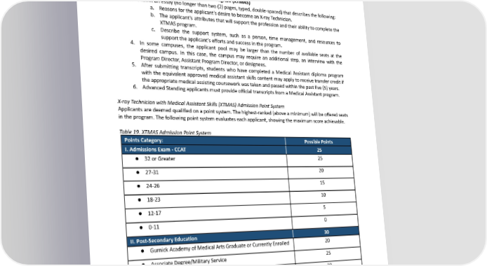 Problem-solving/Decision-making 5 Preparedness 5 Responsibility 5 Total Possible Points for Available: 131 Points X-ray Technician with Medical Assistant Skills Program (XTMAS) 3. Submitanessay(nolongerthantwo(2)pages,typed,double-spaced)thatdescribesthefollowing: a. Reasonsfortheapplicant’sdesiretobecomeanX-rayTechnician. b. The applicant’s attributes that will support the profession and their ability to complete the XTMASprogram. c. Describe the support system, such as a person, time management, and resources to supporttheapplicant’s efforts and success in the program. 4. In some campuses, the applicant pool may be larger than the number of available seats at the desired campus. In this case, the campus may require an additional step, an interview with the ProgramDirector, Assistant Program Director, or designees. 5. After submitting transcripts, students who have completed a Medical Assistant diploma program with the equivalent approved medical assistant skills content may apply to receive transfer credit if theappropriatemedicalassisting coursework was taken and passed within the past five (5) years. 6. AdvancedStandingapplicantsmustprovideofficialtranscripts from a Medical Assistant program. X-ray Technician with Medical Assistant Skills (XTMAS) Admission Point System Applicants are deemed qualified on a point system. The highest-ranked (above a minimum) will be offered seats in the program. The following point system evaluates each applicant, showing the maximum score achievable. Table 19. XTMAS Admission Point System Points Category: Possible Points I. Admissions Exam - CCAT 25 25 ● 32orGreater 20 ● 27-31 15 ● 24-26 10 ● 18-23 5 ● 12-17 0 ● 0-11 II. Post-Secondary Education 30 20 ● GurnickAcademyofMedicalArtsGraduateorCurrentlyEnrolled 25 ● AssociateDegree/MilitaryService 30 ● BaccalaureateDegree III. Academic Achievement: College level Courses & High school courses 50 A. Overall High School GPA 5 ● GPA3.0 56