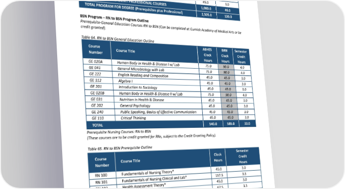 RN405 CommunityHealthNursingClinical* 90.0 2.0 RN500 Leadership/ManagementinNursingTheory 45.0 3.0 RN501 Leadership/ManagementinNursingClinical 90.0 2.0 RN502 Nursing Informatics 45.0 3.0 RN504 Nursing Research Theory 45.0 3.0 RN505 Bachelors AchievementCapstonePortfolio 45.0 3.0 TOTALGURNICKACADEMYPROFESSIONALCOURSES 1,080.0 46.0 TOTALPROGRAMFORDEGREE(PrerequisitesplusProfessional) 2,505.0 120.0 BSNProgram–RNtoBSNProgramOutline Prerequisite-General Education Courses RN to BSN (Can be completed at Gurnick Academy of Medical Arts or be credit granted). Table 64. RN to BSN General Education Outline ABHES BRN Semester Course CourseTitle Clock Clock Credit Number Hours Hours Hours GE020A HumanBodyinHealth&DiseaseIw/Lab 75.0 90.0 4.0 GE041 GeneralMicrobiologywithLab 75.0 90.0 4.0 GE222 English Reading and Composition 45.0 45.0 3.0 GE112 AlgebraI 45.0 45.0 3.0 GE201 Introduction to Sociology 45.0 45.0 3.0 GE020B HumanBodyinHealth&DiseaseIIw/Lab 75.0 90.0 4.0 GE031 Nutrition in Health & Disease 45.0 45.0 3.0 GE202 GeneralPsychology 45.0 45.0 3.0 GE240 Public Speaking, Basics of Effective Communication 45.0 45.0 3.0 GE110 Critical Thinking 45.0 45.0 3.0 TOTAL 540.0 585.0 33.0 Prerequisite Nursing Courses: RN to BSN (These courses are to be credit granted for RNs, subject to the Credit Granting Policy). Table 65. RN to BSN Prerequisite Outline Semester Clock Course CourseTitle Credit Number Hours Hours RN100 FundamentalsofNursingTheory* 45.0 3.0 RN101 FundamentalsofNursingClinicalandLab* 157.5 3.5 RN102 Health AssessmentTheory* 45.0 3.0 RN103 Health AssessmentSkills Lab* 67.5 1.5 RN104 Pharmacology 45.0 3.0 RN106 Pathophysiology 45.0 3.0 RN200 Medical/Surgical I Theory-Introduction to Med/Surg* 45.0 3.0 RN201 Medical/Surgical I Clinical-Introduction to Med/Surg* 90.0 2.0 214