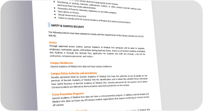 ● Destructionordamagetopersonalorschoolproperty. ● Recklessdrivingorparkingviolationsoncampus. ● Hazingofstudentsorinitiationthatisdangerous,harmful,ordegrading. ● Distribution or obstruction of instruction, classroom activity, research, administrative activity, or other school activity on campus. ● Forcefulorillegalentryintoanareaoftheschoolproperty. ● Cheatingorstealing. ● Illegal activities or other actions deemed inappropriate by the Director. ● Distributing or posting materials, publications, leaflets, or other printed materials without prior permission from the school administration. ● Possessionoffirearms,fireworks,explosives, or any other weapons. ● Falsealarmsorthreats. ● SexualHarassmentofanykind. ● FailuretocomplywiththeGurnickAcademyofMedicalArtspoliciesandprocedures. SAFETY&CAMPUSSECURITY The following policies have been adopted to comply with the requirements of the Campus Security Act (34 CFR 668.46). Access Through approved access control, Gurnick Academy of Medical Arts campuses will be open to students, employees, contractors, guests, and invitees during business hours. Access to all Gurnick Academy of Medical Arts facilities is through the Verkada Pass application for students and staff and through a key fob for contractors, temporary personnel, and visitors. CampusResidences Gurnick AcademyofMedicalArtsdoesnothavecampusresidences. CampusPoliceAuthorityandJurisdiction Security personnel hired by Gurnick Academy of Medical Arts have the authority to ask all people on the premises of Gurnick Academy of Medical Arts for identification and to determine whether those individuals have lawful business at Gurnick Academy of Medical Arts. Security personnel do not possess arrest power. Criminal incidents are referred to the local police, who have jurisdiction on the campus. CrimePreventionPrograms Gurnick Academy of Medical Arts does not have a crime prevention program. In addition, Gurnick Academy of Medical Arts does not have any off-campus student organizations that require monitoring of criminal activity off campus. Security Awareness Programs During initial enrollment, students are informed of services offered by Gurnick Academy of Medical Arts. Students are told about crime on campus. Similar information is presented to new employees during new hire orientation. Gurnick campuses create and maintain an EPP (Emergency Response Plan) as a guide for emergencies. Students and staff may access the EPP in the lobby of each campus. Campuses also practice emergency response protocols quarterly. Periodically, as determined to be needed, presentations or materials may be 120