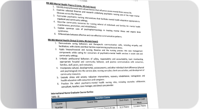 4. Teachnewadaptivemeasuresandcounselchildrenandfamiliescopingwithsizablestress. 5. Assess the child’s health disruption parameters regarding the family unit while providing support andinformation. 6. Implement protective interventions and provide age-appropriate nurturance for children and families with considerable health disruptions. 7. Collaborate with professional colleagues and student groups to develop and provide continuity of care. 8. Demonstrateprofessionalbehavior. RN400MentalHealthTheory(2Units,30clockhours) 1. Identify biopsychosocial and cultural factors that influence severe mental illness across life. 2. Examine selected theories and research underlying psychiatric nursing care of the major mental illnesses across the lifespan. 3. Formulate psychiatric nursing interventions that facilitate mental health adaptation appropriate to inpatient and community settings. 4. Describe community resources for nursing referral of individuals and families for mental health maintenance,promotion,andrehabilitation. 5. Explain common uses of psychopharmacology in treating mental illness and organic brain syndromes. 6. Differentiate between effective and non-effective communication patterns. RN401MentalHealthClinical(2Units,90clockhours) 1. Demonstrate caring behaviors and therapeutic communication skills, including empathy and facilitation, with clients and their families experiencing psychosocial stress. 2. Apply biopsychosocial and nursing theories and the nursing process into case management components while caring for consumers of psychiatric-mental health services in acute care and communitysettings. 3. Embody professional behaviors of safety, responsibility and accountability, team membership, appropriate hospital and community behavior, and positive communication with consumers, families, staff, peers, and instructors. 4. Incorporate cultural, developmental, socioeconomic, and other individual client differences (physical and psychological) into the service plan, nursing care plan, client care activities, and development of communityresources. 5. Execute stress and anxiety reduction interventions, recovery, rehabilitation, reintegration, and health education with consumers and caregivers. 6. Practice the select psychiatric-mental health nursing roles, including counselor, collaborator, consultant, teacher, case manager, and direct care provider. International Nurse Graduate Course Outline Table 78. Transition Course Course CourseTitle Clock Hours SemesterCredit Number Hours RN180 Nursing Transition Advanced Placement Theory & Lab 52.5 Theory 3.5 Units Theory Course 67.5 Lab 1.5 Units Lab TOTAL 120.0 5.0 Table 79. Medical-Surgical Nursing 244