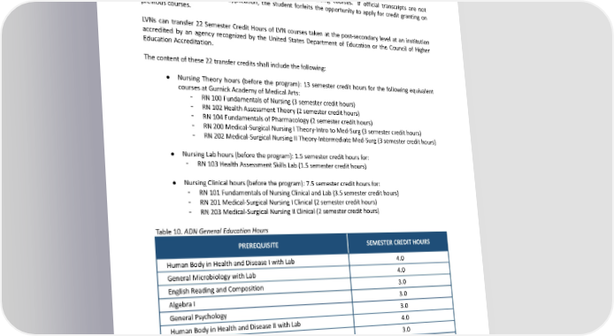 o If necessary, Applicants will be asked to pass an interview with the Nursing Program Director or Associate Program Director in person or via a virtual conferencing platform. o Applicants must submit a two to three-page (2 – 3) written essay on why they have chosen professional nursing as a career. Credit Granting for Nursing Education Students may request credit granting for previously taken nursing courses. If official transcripts are not submitted at the time of the application, the student forfeits the opportunity to apply for credit granting on previous courses. LVNs can transfer 22 Semester Credit Hours of LVN courses taken at the post-secondary level at an institution accredited by an agency recognized by the United States Department of Education or the Council of Higher Education Accreditation. Thecontentofthese22transfercreditsshallincludethefollowing: ● Nursing Theory hours (before the program): 13 semester credit hours for the following equivalent courses at Gurnick Academy of Medical Arts: - RN100FundamentalsofNursing(3semestercredithours) - RN102HealthAssessmentTheory(2semestercredithours) - RN104FundamentalsofPharmacology(2semestercredithours) - RN200 Medical-Surgical Nursing I Theory-Intro to Med-Surg (3 semester credit hours) - RN202 Medical-Surgical Nursing II Theory-Intermediate Med-Surg (3 semester credit hours) ● NursingLabhours(before theprogram):1.5semestercredithoursfor: - RN103HealthAssessmentSkillsLab(1.5semestercredithours) ● NursingClinicalhours(beforethe program):7.5semestercredithoursfor: - RN101FundamentalsofNursingClinicalandLab(3.5semestercredithours) - RN201Medical-SurgicalNursingIClinical(2semestercredithours) - RN203Medical-SurgicalNursingIIClinical (2 semester credit hours) Table 10. ADN General Education Hours PREREQUISITE SEMESTERCREDITHOURS HumanBodyinHealthandDiseaseIwithLab 4.0 GeneralMicrobiologywithLab 4.0 English Reading and Composition 3.0 Algebra I 3.0 GeneralPsychology 3.0 HumanBodyinHealthandDiseaseIIwithLab 4.0 Nutrition in Health & Disease 3.0 Critical Thinking 3.0 Introduction to Sociology 3.0 Public Speaking, Basics of Effective Communication 3.0 TOTALGURNICKACADEMYGENERALEDUCATIONCOURSES 33.0 39