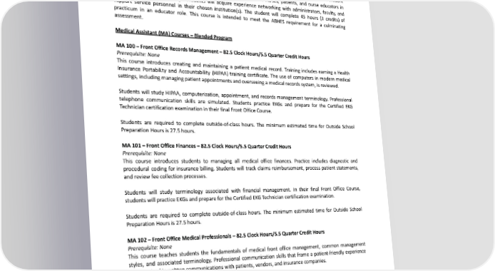 supported. MSN607–NursingPracticumB–AcademicNurseEducator–45ClockHours/3SemesterCreditHours Prerequisite: Completion of BSN Degree and Active RN License. This course allows learners to apply concepts and expand skills in curriculum development, classroom and clinical teaching, and assessment methods in an educator role within the learner’s specialization. The student may select from various opportunities in clinical settings with staff nurses, patients, and nurse educators in clinical and academic settings. Students will acquire experience networking with administrators, faculty, and support service personnel in their chosen institution(s). The student will complete 45 hours (3 credits) of practicum in an educator role. This course is intended to meet the ABHES requirement for a culminating assessment. MedicalAssistant(MA)Courses–BlendedProgram MA100–FrontOfficeRecordsManagement–82.5ClockHours/5.5QuarterCreditHours Prerequisite: None This course introduces creating and maintaining a patient medical record. Training includes earning a Health Insurance Portability and Accountability (HIPAA) training certificate. The use of computers in modern medical settings, including managing patient appointments and overseeing a medical records system, is reviewed. Students will study HIPAA, computerization, appointment, and records management terminology. Professional telephone communication skills are simulated. Students practice EKGs and prepare for the Certified EKG Technician certification examination in their final Front Office Course. Students are required to complete outside-of-class hours. The minimum estimated time for Outside School Preparation Hours is 27.5 hours. MA101–FrontOfficeFinances–82.5ClockHours/5.5QuarterCreditHours Prerequisite: None This course introduces students to managing all medical office finances. Practice includes diagnostic and procedural coding for insurance billing. Students will track claims reimbursement, process patient statements, andreviewfeecollectionprocesses. Students will study terminology associated with financial management. In their final Front Office Course, students will practice EKGs and prepare for the Certified EKG Technician certification examination. Students are required to complete outside-of-class hours. The minimum estimated time for Outside School Preparation Hours is 27.5 hours. MA102–FrontOfficeMedicalProfessionals–82.5ClockHours/5.5QuarterCreditHours Prerequisite: None This course teaches students the fundamentals of medical front office management, common management styles, and associated terminology. Professional communication skills that frame a patient-friendly experience are practiced in written communications with patients, vendors, and insurance companies. The oversight of reception and treatment areas, patient and employee safety, supplies inventory and ordering, employee training, and office emergency preparedness are included. In their final Front Office Course, students will practice EKGs and prepare for the Certified EKG Technician certification examination. Students are required to complete outside-of-class hours. The minimum estimated time for Outside School Preparation Hours is 27.5 hours. 309