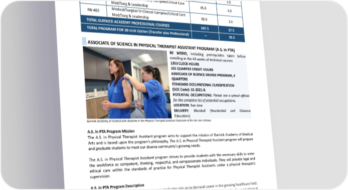 RN103 Health AssessmentSkills Lab 67.5 1.5 RN304 Medical/Surgical III Theory-Advanced Med/Surg 45.0 3.0 RN305 Medical/Surgical III Clinical-Advanced Med/Surg 90.0 2.0 RN400 30.0 MentalHealthTheory 2.0 RN401 90.0 MentalHealthClinical 2.0 Medical/Surgical IV Theory-Complex/Critical Care RN402 45.0 3.0 Med/Surg&Leadership Medical/Surgical IV Clinical-Complex/Critical Care RN403 90.0 2.0 Med/Surg&Leadership TOTALGURNICKACADEMYPROFESSIONALCOURSES 607.5 17.5 TOTALPROGRAMFOR30-UnitOption(TransferplusProfessional) — 25.5 ASSOCIATEOFSCIENCEINPHYSICALTHERAPISTASSISTANTPROGRAM(A.S.inPTA) 80 WEEKS, including prerequisites taken before enrolling in the 44 weeks of technical courses 1353CLOCKHOURS 101QUARTERCREDITHOURS ASSOCIATEOFSCIENCEDEGREEPROGRAM,4 QUARTERS STANDARDOCCUPATIONALCLASSIFICATION (SOCCode):31-2021.0. POTENTIAL OCCUPATIONS: Please see a school official for the complete list of potential occupations. LOCATION:SanJose DELIVERY: Blended (Residential and Distance Education) Gurnick AcademyofMedicalArtsstudentsinthePhysicalTherapistAssistantclassroomattheSanJosecampus. A.S. in PTA Program Mission The A.S. in Physical Therapist Assistant program aims to support the mission of Gurnick Academy of Medical Arts and is based upon the program’s philosophy. The A.S. in Physical Therapist Assistant program will prepare andgraduatestudentstomeetourdiversecommunity’sgrowingneeds. The A.S. in Physical Therapist Assistant program strives to provide students with the necessary skills to enter the workforce as competent, thinking, respectful, and compassionate individuals. They will provide legal and ethical care within the standards of practice for Physical Therapist Assistants under a physical therapist’s supervision. A.S. in PTA Program Description A.S. in Physical Therapist Assistant program graduates join an in-demand career in the growing healthcare field. Physical Therapist Assistants provide physical therapy services under the supervision of a licensed physical therapist, which is within the scope of practice for PTAs. They provide patients with instructions for therapeutic exercise and utilize therapeutic modalities that incorporate massage, stretching, selected manual therapy interventions, and electrotherapies. The program includes classwork, laboratory training, and clinical experiences correlating with theoretical education. The technical courses incorporate the minimum skills of Physical Therapist Assistant graduates at the 198