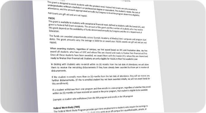 FEDERALFINANCIALAIDPROGRAMS Federal financial aid programs include the Federal Pell Grant, Federal Supplemental Opportunity Grant (FSEOG), Federal Direct Subsidized Loans, Federal Direct Unsubsidized Loans, and PLUS Loans. The Iraq Afghanistan Service Grant and the Children of Fallen Heroes Scholarship are additional federal aid programs. Federal Pell Grant This grant is designed to assist students with the greatest need. Federal Pell Grants are only awarded to undergraduateswithoutabachelor’sorprofessionaldegreeorequivalent.Thestudent’sneeds,thecostof attendance, and the amount appropriated annually by Congress to fund the program determine eligibility. Pell Grants are gift aid and are not repaid. FSEOG This grant is available to students with exceptional financial need, defined as students with the lowest EFC, and given to Federal Pell Grant recipients. The amount of the grant and the number of students who may receive this grant depend on the availability of funds determined annually by Congress and the U.S. Department of Education. The funds are awarded proportionally across Gurnick Academy of Medical Arts’ campuses and program start dates. The grant amounts vary; the average is $600 for an award year. FSEOG awards are gift aid and are not repaid. When awarding students, regardless of campus, we first award based on EFC and finalization date. We first award all students who have a 0 EFC and whose files are cleared and ready to finalize their financial aid first. Once all these students have been awarded, we award them with the lowest EFCs whose files are cleared and readytofinalize their financial aid. Students are only eligible for FSEOG in their first academic year. In dealing with students who re-enroll within six (6) months from the last date of attendance, we will allow them to receive the remaining disbursements if they have already been awarded but have yet to receive all disbursements. If the student re-enrolls more than six (6) months from the last date of attendance, they will not receive any further disbursements. (If the re-enrolled student has not been awarded initially, we will not award funds for this enrollment). If a student withdraws from one program and then enrolls in a new program, regardless of whether they enroll within six (6) months or have received an award in the prior program, that student is eligible to be awarded. Example:astudentwhowithdrawsfromtheMAprogramandenrollsintheVNprogram Federal Work-Study(FWS) TheFederalWork-StudyProgramprovidespart-timeemploymenttostudentswhorequiretheearningsto defray the cost of their education. Students may work on or off-campus for a qualified public, private, or communityserviceorganization. Eligibility is based on financial need and the availability of funds. The school will attempt to place students in jobs related to their program of study, and work schedules will be arranged according to class schedules. Congress and the U.S. Department of Education provide the funding that determines the school’s allocation amountandthenumberofstudentswhomayreceivethesefunds. 100