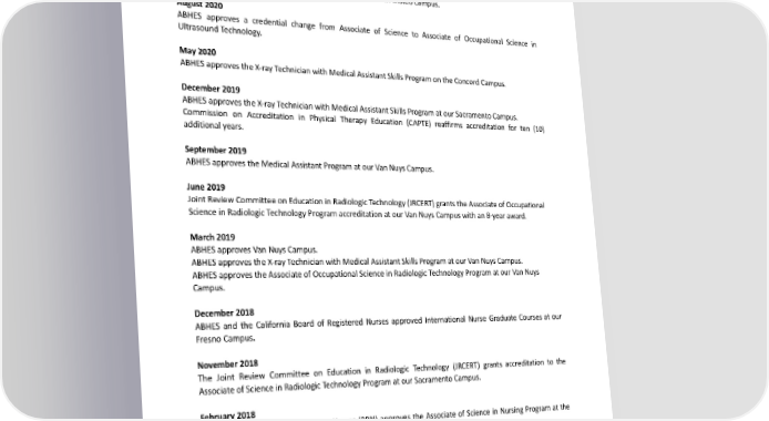 May2021 The Commission on Accreditation of Allied Health Education Program (CAAHEP) grants our Associate of Occupational Science in Ultrasound Technology Program Vascular concentration accreditation at our San Mateo Campus. October2020 TheDentalAssistantprogramhasbeendiscontinuedatourSanMateocampus. August2020 ABHES approves a credential change from Associate of Science to Associate of Occupational Science in Ultrasound Technology. May2020 ABHESapprovestheX-rayTechnicianwithMedicalAssistantSkillsProgramontheConcordCampus. December2019 ABHESapprovestheX-rayTechnicianwithMedicalAssistantSkillsProgramatourSacramentoCampus. Commission on Accreditation in Physical Therapy Education (CAPTE) reaffirms accreditation for ten (10) additional years. September2019 ABHESapprovestheMedicalAssistantProgramatourVanNuysCampus. June2019 Joint Review Committee on Education in Radiologic Technology (JRCERT) grants the Associate of Occupational Science in Radiologic Technology Program accreditation at our Van Nuys Campus with an 8-year award. March2019 ABHESapprovesVanNuysCampus. ABHESapprovestheX-rayTechnicianwithMedicalAssistantSkillsProgramatourVanNuysCampus. ABHESapprovestheAssociateofOccupationalScienceinRadiologicTechnologyProgramatourVanNuys Campus. December2018 ABHES and the California Board of Registered Nurses approved International Nurse Graduate Courses at our FresnoCampus. November2018 The Joint Review Committee on Education in Radiologic Technology (JRCERT) grants accreditation to the Associate of Science in Radiologic Technology Program at our Sacramento Campus. February2018 The California Board of Registered Nurses (BRN) approves the Associate of Science in Nursing Program at the FresnoCampus. August2017 ABHESapprovestheDentalAssistantProgramattheModestoCampus. January2017 ABHESapprovestheSacramentoCampus. 12