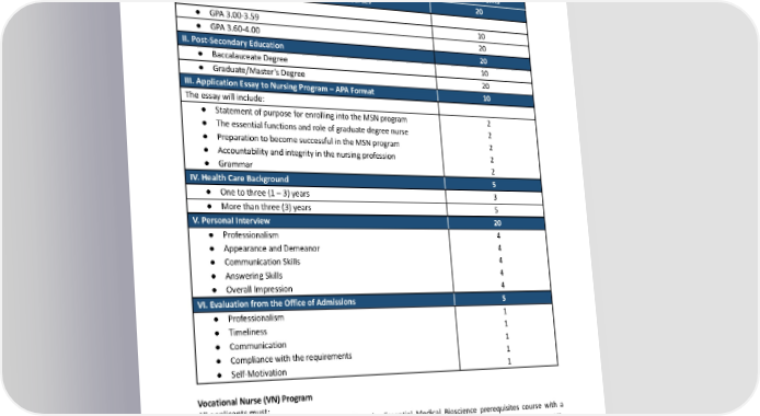 o PersonalLettersofRecommendation o CommunityWork o HealthRelatedExperience Table 17. BSN to MSN Admission Point System Criteria Possible Points I. Academic Achievement: UndergraduateLevelCourses 20 A. GPA ● GPA3.00-3.59 10 ● GPA3.60-4.00 20 II. Post-Secondary Education 20 ● BaccalaureateDegree 10 ● Graduate/Master’sDegree 20 III. Application Essay to Nursing Program – APA Format 10 Theessaywillinclude: ● StatementofpurposeforenrollingintotheMSNprogram 2 ● Theessentialfunctionsandroleofgraduatedegreenurse 2 ● PreparationtobecomesuccessfulintheMSNprogram 2 ● Accountabilityandintegrityinthenursingprofession 2 ● Grammar 2 IV. Health Care Background 5 ● Onetothree(1–3)years 3 ● Morethanthree(3)years 5 V. Personal Interview 20 ● Professionalism 4 ● AppearanceandDemeanor 4 ● CommunicationSkills 4 ● AnsweringSkills 4 ● OverallImpression 4 VI. Evaluation from the Office of Admissions 5 ● Professionalism 1 ● Timeliness 1 ● Communication 1 ● Compliancewiththerequirements 1 ● Self-Motivation 1 Vocational Nurse (VN) Program All applicants must: 1. Be at least 17 to be admitted to the Essential Medical Bioscience prerequisites course with a parent’s or guardian’s consent. Applicants must be at least 18 at the beginning of the core program. 2. CompletetheEssentialMedicalBioscienceprerequisitescoursewithapassinggradeasidentifiedin thesyllabus. a. The Essential Medical Bioscience course is waived as a prerequisite for those who have completed the following courses within the last five (5) years: Cell Biology, Human Biology Basics, Basic Math, and Medical Terminology. A prerequisite course challenge exam is also available for those who are interested. 54