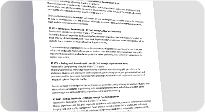 Prerequisite: Completion of Module II with a “C” or better. Thecourseprovidesbasicinformationaboutelectricity, magnetism, and electromagnetism and applies these principles to the X-ray circuit. In addition, it provides a knowledge base in radiographic, fluoroscopic, and mobileequipmentrequirements,function,anddesign.Thiscoursewillincludeoutside-of-schoolpreparation hourssuchasreadingandwritingassignments,practiceandpracticalapplicationassignments,andprojects.A minimumof25hoursofout-of-classworkwillbeassigned. RT132–EthicsandLawinRadiography–24ClockHours/2QuarterCreditHours Prerequisite: Completion of Module II with a “C” or better. Thecourseprovidesafundamentalmedicallaw,ethics,andhumandiversitybackground.Thehistoricaland philosophical basis of ethics and the elements of ethical behavior will be discussed. The student will examine various ethical issues and dilemmas found in clinical practice. Courseactivities will include research and analysis on case studies germane to medical imaging. An introduction to legal terminology, concepts, and principles will also be presented. Topics include misconduct, malpractice, legal, and the ASRT professional standards. RT133–RadiographicProceduresIII–45ClockHours/4.5QuarterCreditHours Prerequisite: Completion of Module II with a “C” or better. Contentisdesignedtoprovidetheknowledgebasenecessarytoperformstandardimaging.Emphasisison basic imaging of the Abdomen, Soft-Tissue Neck, Digestive System, and Urinary System. Consideration will be given to the production of images of optimal diagnostic quality. Coursemethodswillincorporatelectures,demonstrations,imageanalyses,positioninglabpracticum,and self-paced study using multimedia programs. Students must demonstrate competency in positioning skills, equipmentmanipulation,andradiationprotectionbeforeperformingtheseskillsundersupervisioninthe patient care setting. RT133L–RadiographicProceduresIIILab–33ClockHours/1.5QuarterCreditHours Prerequisite: Completion of Module II with a “C” or better. Thecourseprovidesaknowledgebasenecessarytoperformstandardradiographicproceduresofthe abdomen.Studentswillalsoreviewthebiliarysystem,genitourinarysystem,andgastrointestinaltract, and procedureswill be done using fluoroscopy and endoscopy. Consideration will be given to the production of imagesofoptimaldiagnosticquality. Coursemethodswillincorporatedemonstrations,imageanalyses,andpositioninglabpracticum.Studentsmust demonstratecompetencyinpositioningskills, equipmentmanipulation,andradiationprotectionbefore performingtheseskills under direct supervision in the patient care setting. RT140C–ClinicalPracticeIV–192ClockHours/6QuarterCreditHours Prerequisite: Completion of Module III with a “C” or better. Clinical experiences are designed to provide patient care and assessment, competent performance of radiologic imaging, and total quality management. Team practice, patient-centered clinical practice, and professional developmentareevaluatedthroughstructured,competency-basedclinicalassignments.Competencylevels ensurethepatient’s well-being before, during, and following the radiologic procedure. RT142–RadiographicPathology–48ClockHours/4.5QuarterCreditHours Prerequisite: Completion of Module III with a “C” or better. Thecourseprovidestheoriesofdiseasecausationandthepathophysiologicaldisordersthatcompromise healthy systems. Etiology, pathophysiological responses, clinical manifestations, radiographic appearance, and managementofalterationsinbodysystemswillbepresented.Studentswillberequiredtowritearesearch 290