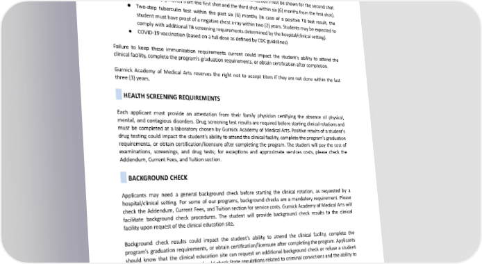 following immunities and vaccinations (immunization documents or evidence of a blood titer) before the clinical component can be attended: ● Varicellaimmunity ● MMRimmunity ● Up-to-datetetanusshots(definedaswithinthepastten[10]years) ● Hepatitis B vaccine series (If incomplete, proof of immunization must be shown for the second shot within one [1] month from the first shot and the third shot within six [6] months from the first shot). ● Two-step tuberculin test within the past six (6) months (In case of a positive TB test result, the student musthaveproofofanegativechestx-raywithintwo[2]years.Studentsmaybeexpectedto complywithadditionalTBscreeningrequirementsdeterminedbythehospital/clinicalsetting). ● COVID-19vaccination(basedonafulldoseasdefinedbyCDCguidelines) Failure to keep these immunization requirements current could impact the student’s ability to attend the clinical facility, complete the program’s graduation requirements, or obtain certification after completion. Gurnick Academy of Medical Arts reserves the right not to accept titers if they are not done within the last three (3) years. HEALTHSCREENINGREQUIREMENTS Each applicant must provide an attestation from their family physician certifying the absence of physical, mental, and contagious disorders. Drug screening test results are required before starting clinical rotations and must be completed at a laboratory chosen by Gurnick Academy of Medical Arts. Positive results of a student’s drug testing could impact the student’s ability to attend the clinical facility, complete the program’s graduation requirements, or obtain certification/licensure after completing the program. The student will pay the cost of examinations, screenings, and drug tests; for exceptions and approximate services costs, please check the Addendum,CurrentFees,andTuitionsection. BACKGROUNDCHECK Applicants may need a general background check before starting the clinical rotation, as requested by a hospital/clinical setting. For some of our programs, background checks are a mandatory requirement. Please check the Addendum, Current Fees, and Tuition section for service costs. Gurnick Academy of Medical Arts will facilitate background check procedures. The student will provide background check results to the clinical facility upon request of the clinical education site. Background check results could impact the student’s ability to attend the clinical facility, complete the program’s graduation requirements, or obtain certification/licensure after completing the program. Applicants should know that the clinical education site can request an additional background check or refuse a student based ontheresults. Applicants should check State regulations related to criminal convictions and the ability to belicensed. CPR Before starting any program or its clinical rotation component, students must submit proof of completion and current certification in CPR for Basic Life Support. Failure to keep this certification current could impact the 74