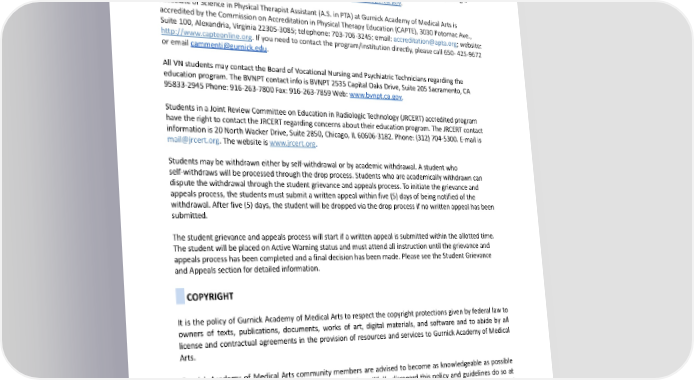 All grievances and appeals will be handled discreetly. Dissemination of the resolution will be at the discretion of the CampusDirector or Appeals Committee and on a “need-to-know” basis. The decisions rendered by the AppealsCommitteewillbethefinalandbindingdecisionofGurnickAcademyofMedicalArts. At any time, a student or any member of the public may file a complaint about Gurnick Academy of Medical Arts with the Bureau for Private Postsecondary Education by calling 888.370.7589 toll-free or completing a complaint form obtainable on the bureau’s Internet website at www.bppe.ca.gov. Associate of Science in Physical Therapist Assistant (A.S. in PTA) at Gurnick Academy of Medical Arts is accredited by the Commission on Accreditation in Physical Therapy Education (CAPTE), 3030 Potomac Ave., Suite 100, Alexandria, Virginia 22305-3085; telephone: 703-706-3245; email: accreditation@apta.org; website: http://www.capteonline.org. If you need to contact the program/institution directly, please call 650- 425-9672 or email cammenti@gurnick.edu. All VN students may contact the Board of Vocational Nursing and Psychiatric Technicians regarding the education program. The BVNPTcontactinfoisBVNPT2535CapitalOaksDrive,Suite205Sacramento,CA 95833-2945Phone:916-263-7800Fax:916-263-7859Web:www.bvnpt.ca.gov. Students in a Joint Review Committee on Education in Radiologic Technology (JRCERT) accredited program havetherighttocontacttheJRCERTregardingconcernsabouttheireducationprogram.TheJRCERTcontact information is 20 North Wacker Drive, Suite 2850, Chicago, IL 60606-3182. Phone: (312) 704-5300. E-mail is mail@jrcert.org. The website is www.jrcert.org. Students maybewithdrawneitherbyself-withdrawalorbyacademicwithdrawal.Astudentwho self-withdraws will be processed through the drop process. Students who are academically withdrawn can dispute the withdrawal through the student grievance and appeals process. To initiate the grievance and appeals process, the students must submit a written appeal within five (5) days of being notified of the withdrawal. After five (5) days, the student will be dropped via the drop process if no written appeal has been submitted. Thestudentgrievanceandappealsprocesswillstartifawrittenappealissubmittedwithintheallottedtime. ThestudentwillbeplacedonActiveWarningstatusandmustattendallinstructionuntilthegrievanceand appeals process has been completed and a final decision has been made. Please see the Student Grievance andAppealssectionfordetailedinformation. COPYRIGHT It is the policy of Gurnick Academy of Medical Arts to respect the copyright protections given by federal law to owners of texts, publications, documents, works of art, digital materials, and software and to abide by all license and contractual agreements in the provision of resources and services to Gurnick Academy of Medical Arts. Gurnick Academy of Medical Arts community members are advised to become as knowledgeable as possible regarding copyright law and this policy. Individuals who willfully disregard this policy and guidelines do so at their own risk and may be subject to personal liability. Gurnick Academy of Medical Arts regards a violation of this policy as a serious matter. Any such violation is without its consent and is subject to disciplinary action, including termination of Gurnick Academy of Medical Arts employees and expulsion of students. The use of copyrighted material(s) is permissible with written permission from the owner(s). The Campus Director can provide a sample request letter. When consent is received, please provide a copy of the signed 138