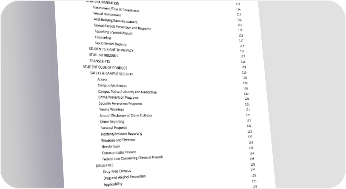 RETURNOFNON-TITLEIVFUNDS 112 WITHDRAWALS&THERETURNTOTITLEIVAID(R2T4)CALCULATION 112 ADMINISTRATIVEPOLICIES 113 CATALOGPOLICIES 113 PROGRAMPOLICIES 113 INDIVIDUALRESPONSIBILITY 114 ACADEMICFREEDOM 114 NON-DISCRIMINATION 114 Harassment/Title IX Coordinator 114 Sexual Harassment 115 Anti-Bullying/Anti-Harassment 115 Sexual Assault Prevention and Response 115 Reporting a Sexual Assault 117 Counseling 117 SexOffenderRegistry 117 STUDENT’SRIGHTTOPRIVACY 117 STUDENTRECORDS 118 TRANSCRIPTS 119 STUDENTCODEOFCONDUCT 119 SAFETY&CAMPUSSECURITY 120 Access 120 CampusResidences 120 CampusPoliceAuthorityandJurisdiction 120 CrimePreventionPrograms 120 Security Awareness Programs 120 Timely Warnings 121 AnnualDisclosureofCrimeStatistics 121 CrimeReporting 122 Personal Property 122 Incident/Accident Reporting 122 WeaponsandFirearms 123 NeedleStick 123 CommunicableDisease 124 Federal Law Concerning Chemical Hazards 124 DRUG-FREE 125 Drug-Free Campus 125 DrugandAlcoholPrevention 125 Applicability 125 Prohibited Behavior 125 Notification of Convictions 125 Consequences 126 Assistance 126 Resources 126 Confidentiality 127 SharedResponsibility 127 ReasonableSuspicionTesting 127 6