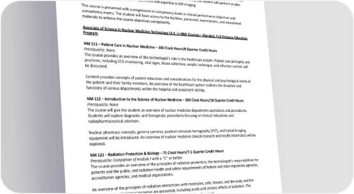 This course allows students to practice the skills to obtain high-quality MR images, objectively alter protocols basedonpatientpathologyorphysicalcondition,identifyimagequalityproblems,andmakeappropriate corrections. The clinical is conducted at a clinical facility after or with didactic instruction. Activities include demonstration and observation, after which the student assists in performing the activity. Thestudentcanperformtheactivityunderdirectsupervisionwhensatisfactoryproficiencyisapparent.When boththestudentandinstructoraresatisfiedwiththestudent’sproficiency,thestudentwillperformstudies underindirect supervision to gain experience and expertise in MR imaging. This course is presented with a progression in competency levels in clinical performance objectives and competencyexams.Thestudentwillhaveaccesstothefacilities,personnel,examinations,andeducational materials to achieve the course objectives competently. Associate of Science in Nuclear Medicine Technology (A.S. in NM) Courses – Blended, Full Distance Education Program NM111–PatientCareinNuclearMedicine–100ClockHours/8QuarterCreditHours Prerequisite: None Thecourseprovidesanoverviewofthetechnologist’sroleinthehealthcaresystem.Patientcareprinciplesand practices, including ECG monitoring, vital signs, blood collection, aseptic technique, and infection control, will bediscussed. Contentprovidesconceptsofpatienteducationandconsiderationsforthephysicalandpsychologicalneedsof thepatient and their family members. An overview of the healthcare system outlines the structure and functions of various departments within the hospital and outpatient setting. NM112–IntroductiontotheScienceofNuclearMedicine–100ClockHours/10QuarterCreditHours Prerequisite: None Thecoursewillgivethestudentanoverviewofnuclearmedicinedepartmentoperationsandprocedures. Students will explore diagnostic and therapeutic procedures focusing on clinical indications and radiopharmaceutical selection. Nuclear pharmacyconcepts,gammacameras,positronemissiontomography(PET),andhybridimaging equipmentwillbeintroduced.Anoverviewofnuclearmedicineclinicalresearchandhealthinformaticswillbe explored. NM121–RadiationProtection&Biology–75ClockHours/7.5QuarterCreditHours Prerequisite: Completion of module I with a “C” or better. Thecourseprovidesanoverviewoftheprinciplesofradiationprotection,thetechnologist’sresponsibilities for patients and the public, and radiation health and safety requirements of federal and state regulatory agencies, accreditation agencies, and medical organizations. Anoverviewoftheprinciplesofradiationinteractionswithmolecules,cells, tissues, and the body and the factors affecting biological response are presented, including acute and chronic effects of radiation. The managementofaradiationsafetyprogramandregulationswillbediscussed. NM122–InstrumentationinNuclearMedicineI–80ClockHours/8QuarterCreditHours Prerequisite: Completion of module I with a “C” or better. Thecourseprovidesstudentswithimagingandnon-imaginginstrumentationprinciplesinnuclearmedicine. Thecoursefocusesonthefunction,design,andqualitycontrolpracticesforgas-filledandscintillation detectors, pulse-height analyzers, spectrometers, and counting systems. The course will discuss the componentsofscintillation camera systems. Nuclear counting statistics will be introduced. 279