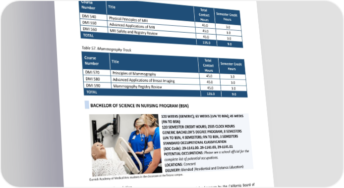 DMI510 Principles of Computed Tomography 45.0 3.0 DMI520 AdvancedApplicationinComputedTomography 45.0 3.0 DMI530 ComputedTomographyRegistryReview 45.0 3.0 TOTAL 135.0 9.0 Table 56. Magnetic Resonance Imaging Track Total Course SemesterCredit Title Contact Number Hours Hours DMI540 Physical Principles of MRI 45.0 3.0 DMI550 AdvancedApplicationsofMRI 45.0 3.0 DMI560 MRISafetyandRegistryReview 45.0 3.0 TOTAL 135.0 9.0 Table 57. MammographyTrack Total Course SemesterCredit Title Contact Number Hours Hours DMI570 Principles of Mammography 45.0 3.0 DMI580 AdvancedApplicationsofBreastImaging 45.0 3.0 DMI590 MammographyRegistryReview 45.0 3.0 TOTAL 135.0 9.0 BACHELOROFSCIENCEINNURSINGPROGRAM(BSN) 120WEEKS(GENERIC);63WEEKS(LVNTOBSN);45WEEKS (RNTOBSN) 120SEMESTERCREDITHOURS;2505CLOCKHOURS GENERICBACHELOR’SDEGREEPROGRAM,8SEMESTERS LVNTOBSN,4SEMESTERS;RNTOBSN,3SEMESTERS STANDARDOCCUPATIONALCLASSIFICATION (SOCCode):29-1141.00.29-1141.03,29-1141.01 POTENTIALOCCUPATIONS:Pleaseseeaschoolofficialforthe completelist of potential occupations. LOCATIONS:Concord DELIVERY:Blended(ResidentialandDistanceEducation) Gurnick AcademyofMedicalArtsstudentsintheclassroomattheFresnocampus. BSNProgramDescription Students will study a wide range of curricular content required for licensure by the California Board of Registered Nursing. Students will also study the organization and function of health services, ethics and law in health care, writing skills for health professionals, leadership and management, nursing research, and the essentials of patient education. Emphasis will be placed on evidence-based practice and critical thinking skills to provide safe and effective care to patients from diverse and multicultural populations and communities across the lifespan. Students will also 209