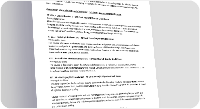 Additional topics pertinent to an entry-level PTA will be presented. These include employment issues, continuedprofessional development, licensure application process, exam preparation strategies, and California PTPractice Acts and Rules and Regulations review. PTA290–LicensureExamPreparation–22ClockHours/2QuarterCreditHours Prerequisite: Completion of PTA 245 with “Pass.” This course reviews information and testing that will aid the student in preparing to take the NPTE for licensure as a PTA in California. A 16-hour workshop is facilitated by an outside educational company specializing in PTA exampreparation. Associate of Science in Radiologic Technology (A.S. in RT) Courses – Blended Program RT110C–ClinicalPracticeI–128ClockHours/4QuarterCreditHours Prerequisite: None Clinical experiences are designed to provide patient care and assessment, competent performance of radiologic imaging, and total quality management. Team practice, patient-centered clinical practice, and professional developmentareevaluatedthroughstructured,competency-basedclinicalassignments.Competencylevels ensurethepatient’s well-being before, during, and following the radiologic procedure. RT111–RadiologicPatientCare–42ClockHours/4QuarterCreditHours Prerequisite: None This course introduces students to basic imaging principles and patient care. Students review medical ethics, pediatrics, and geriatrics patient care. The duties and responsibilities of working in Radiology are also presented, emphasizing communication and relationships. A review of infection control and standard and transmission-based precautions is covered. RT112–RadiationPhysicsandExposure–58ClockHours/5QuarterCreditHours Prerequisite: None Thecourseisdesignedtoteachthenatureandcharacteristicsofradiation,x-rayproduction,andthe fundamentalsofphotoninteractionswithmatter.Contentprovidesbasicinformationabouttheintensityofthe X-ray beamandhowtechnicalfactorsinfluenceit. RT113–RadiographicProceduresI–48ClockHours/4.5QuarterCreditHours Prerequisite: None This course provides the knowledge base to perform standard imaging. Emphasis is on basic Thoracic Viscera, BonyThorax,UpperLimb,andShoulderGirdleimaging.Considerationwillbegiventotheproductionofimages of optimal diagnostic quality. Coursemethodswillincorporatelectures,demonstrations,imageanalyses,positioninglabpracticum,and self-paced study using multimedia programs. Students must demonstrate competency in positioning skills, equipmentmanipulation,andradiationprotectionbeforeperformingtheseskillsunderdirectsupervisionin thepatient care setting. RT113L–RadiographicProceduresILab–30ClockHours/1.5QuarterCreditHours Prerequisite: None Thecourseprovidestheknowledgetoperformstandardimagingoftherespiratorysystem,bonythorax,and upperextremities. Consideration will be given to the production of images of optimal diagnostic quality. Coursemethodswillincorporatedemonstrations,imageanalyses,andpositioninglabpracticum.Studentsmust demonstratecompetencyinpositioningskills, equipmentmanipulation,andradiationprotectionbefore performingtheseskills under direct supervision in the patient care setting. 288