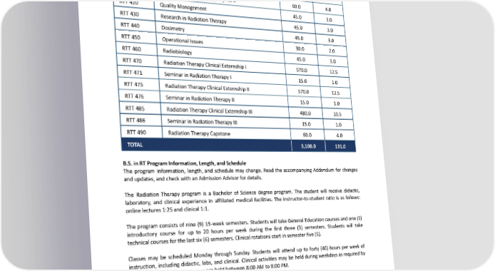 RTT340 Radiation Therapy Patient Care 45.0 3.0 RTT355 Clinical Oncology 45.0 3.0 RTT365 Clinical Concepts II 45.0 3.0 RTT400 Clinical Radiation Therapy Physics I 60.0 4.0 RTT410 Clinical Radiation Therapy Physics II 60.0 4.0 RTT420 Quality Management 45.0 3.0 RTT430 ResearchinRadiationTherapy 45.0 3.0 RTT440 Dosimetry 45.0 3.0 RTT450 Operational Issues 30.0 2.0 RTT460 Radiobiology 45.0 3.0 RTT470 Radiation Therapy Clinical Externship I 570.0 12.5 RTT471 SeminarinRadiationTherapyI 15.0 1.0 RTT475 Radiation Therapy Clinical Externship II 570.0 12.5 RTT476 SeminarinRadiationTherapyII 15.0 1.0 RTT485 Radiation Therapy Clinical Externship III 480.0 10.5 RTT486 SeminarinRadiationTherapyIII 15.0 1.0 RTT490 Radiation Therapy Capstone 60.0 4.0 TOTAL 3,100.0 131.0 B.S. in RT Program Information, Length, and Schedule The program information, length, and schedule may change. Read the accompanying Addendum for changes andupdates,andcheckwithanAdmissionAdvisorfordetails. The Radiation Therapy program is a Bachelor of Science degree program. The student will receive didactic, laboratory, and clinical experience in affiliated medical facilities. The instructor-to-student ratio is as follows: online lectures 1:25 and clinical 1:1. The program consists of nine (9) 15-week semesters. Students will take General Education courses and one (1) introductory course for up to 20 hours per week during the first three (3) semesters. Students will take technical courses for the last six (6) semesters. Clinical rotations start in semester five (5). Classes may be scheduled Monday through Sunday. Students will attend up to forty (40) hours per week of instruction, including didactic, labs, and clinical. Clinical activities may be held during weekdays as required by theclinical site. Didactic courses are held between 8:00 AM to 8:00 PM. Students receive 1,480 didactic and laboratory instruction hours and 1,620 clinical education hours, allowing themtoapplythelecturetopicstopracticaluse. 220