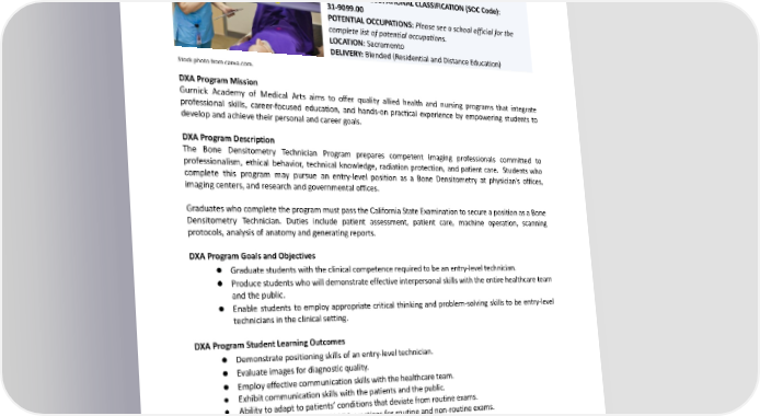 BONEDENSITOMETRYTECHNICIANPROGRAM(DXA) 5WEEKS 56CLOCKHOURS 4QUARTERCREDITHOURS CERTIFICATEPROGRAM STANDARDOCCUPATIONALCLASSIFICATION(SOCCode): 31-9099.00 POTENTIALOCCUPATIONS:Pleaseseeaschoolofficialforthe completelist of potential occupations. LOCATION:Sacramento DELIVERY:Blended(ResidentialandDistanceEducation) Stock photo from canva.com. DXAProgramMission Gurnick Academy of Medical Arts aims to offer quality allied health and nursing programs that integrate professional skills, career-focused education, and hands-on practical experience by empowering students to developandachievetheirpersonalandcareergoals. DXAProgramDescription The Bone Densitometry Technician Program prepares competent imaging professionals committed to professionalism, ethical behavior, technical knowledge, radiation protection, and patient care. Students who complete this program may pursue an entry-level position as a Bone Densitometry at physician’s offices, imagingcenters, and research and governmental offices. GraduateswhocompletetheprogrammustpasstheCaliforniaStateExaminationtosecureapositionasaBone Densitometry Technician. Duties include patient assessment, patient care, machine operation, scanning protocols, analysis of anatomy and generating reports. DXAProgramGoalsandObjectives ● Graduatestudentswiththeclinicalcompetencerequiredtobeanentry-leveltechnician. ● Producestudentswhowilldemonstrateeffectiveinterpersonalskillswiththeentirehealthcareteam andthepublic. ● Enable students to employ appropriate critical thinking and problem-solving skills to be entry-level technicians in the clinical setting. DXAProgramStudentLearningOutcomes ● Demonstratepositioningskillsofanentry-leveltechnician. ● Evaluateimagesfordiagnosticquality. ● Employeffectivecommunicationskillswiththehealthcareteam. ● Exhibitcommunicationskillswiththepatientsandthepublic. ● Abilitytoadapttopatients’conditionsthatdeviatefromroutineexams. ● UtilizepropersafetyandALARApracticesforroutineandnon-routineexams. DXAProgramOutline Table 69. DXA Program Course Outline Course Quarter Title Clock Hours Number Credit Hours 221