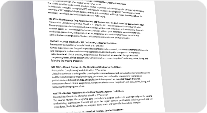 NM251–Cross-SectionalAnatomy–48ClockHours/4.5QuarterCreditHours Prerequisite: Completion of module IV with a “C” or better. Thecourseprovidesentry-levelnuclearmedicinestudentswithprinciplesrelatedtosectionalanatomy.Course content will provide an overview of the body’s transverse, coronal, oblique, and sagittal sectional anatomy. Anatomicallandmarksandnormalversusabnormalanatomyandpathologicalprocesseswillbereviewed. Correlations between 3D, CT, MRI, and PET images are explored. NM252–PrinciplesofPETinNuclearMedicine–60ClockHours/QuarterCreditHours Prerequisite: Completion of module IV with a “C” or better. Thecourseprovidesstudentswithprinciplesrelatedtopositronemissiontomography(PET)andhybridimaging techniques in computed tomography(CT)andmagneticresonanceimaging(MRI).Thiscourseprovidesan overviewofPETradionuclideproduction,physics,instrumentation,andimagefusion.Studentswilllearnthe oncologic, neurologic, and cardiac applications of PET imaging. NM253–Pharmacology,DrugAdministration,andVenipuncture–54ClockHours/4.5QuarterCreditHours Prerequisite: Completion of module IV with a “C” or better. BLS class completion with current certification. Thecourseprovidesbasicconceptsofpharmacology,venipuncturetechniques,andadministeringdiagnostic contrast agents and intravenous medications. Students will recognize patient and scenario-specific risks, medicationprecautions, and contraindications. Preparation and monitoring techniques for medication administration are emphasized. Students will perform venipuncture on a virtual simulator. NM260C–ClinicalPracticeII–360ClockHours/12QuarterCreditHours Prerequisite: Completion of module V with a “C” or better. Clinical experiences are designed to provide patient care and assessment, competent performance of diagnostic andtherapeuticnuclearmedicineimagingprocedures,andtotalqualitymanagement.Teampractice, patient-centered clinical practice, and professional development are evaluated through structured, competency-basedclinical assignments. Competency levels ensure the patient’s well-being before, during, and following the imaging procedure. NM270C–ClinicalPracticeIII–384ClockHours/12.5QuarterCreditHours Prerequisite: Completion of module VI with a “C” or better. Clinical experiences are designed to provide patient care and assessment, competent performance of diagnostic andtherapeuticnuclearmedicineimagingprocedures,andtotalqualitymanagement.Teampractice, patient-centered clinical practice, and professional development are evaluated through structured, competency-basedclinical assignments. Competency levels ensure the patient’s well-being before, during, and following the imaging procedure. NM271–NuclearProceduresIII–36ClockHours/3.5QuarterCreditHours Prerequisite: Completion of module VI with a “C” or better. The course reviews the program’s core curriculum to prepare students to study for and pass the national credentialing examination. Content will cover the registry content specifications, including patient care and procedures. Students will take mock registry board exams and learn effective studying strategies. NM280C–ClinicalPracticeIV–360ClockHours/12QuarterCreditHours Prerequisite: Completion of module VII with a “C” or better. Clinical experiences are designed to provide patient care and assessment, competent performance of diagnostic andtherapeuticnuclearmedicineimagingprocedures,andtotalqualitymanagement.Teampractice, patient-centered clinical practice, and professional development are evaluated through structured, competency-basedclinical assignments. Competency levels ensure the patient’s well-being before, during, and following the imaging procedure. NM281–NuclearMedicineCapstone–36ClockHours/3.5QuarterCreditHours 281