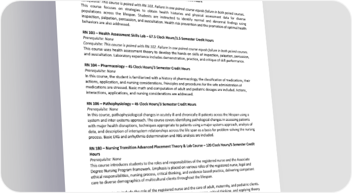 Prerequisite: None Corequisite: This course is paired with RN 100. Failure in one paired course equals failure in both paired courses. This course integrates concepts, theories, and skills fundamental to nursing practice. Students will use the nursing process to plan and provide for adult patients’ cultural, physiological, social, psychological, and spiritual needswithhealthdisruptions. RN102–HealthAssessmentTheory–30ClockHours/2SemesterCreditHours Prerequisite: None Corequisite: This course is paired with RN 103. Failure in one paired course equals failure in both paired courses. This course focuses on strategies to obtain health histories and physical assessment data for diverse populations across the lifespan. Students are instructed to identify normal and abnormal findings using inspection, palpation, percussion, and auscultation. Health risk prevention and the promotion of optimal health behaviors are also addressed. RN103–HealthAssessmentSkillsLab–67.5ClockHours/1.5SemesterCreditHours Prerequisite: None Corequisite: This course is paired with RN 102. Failure in one paired course equals failure in both paired courses. This course uses health assessment theory to develop the hands-on skills of inspection, palpation, percussion, andauscultation. Laboratory experience includes demonstration, practice, and critique of skill performance. RN104–Pharmacology–45ClockHours/3SemesterCreditHours Prerequisite: None In this course, the student is familiarized with a history of pharmacology, the classification of medications, their actions, application, and nursing considerations. Principles and procedures for the safe administration of medications are stressed. Basic math and computation of adult and pediatric dosages are included. Actions, interactions, applications, and nursing considerations are addressed. RN106–Pathophysiology–45ClockHours/3SemesterCreditHours Prerequisite: None In this course, pathophysiological changes in acutely ill and chronically ill patients across the lifespan using a systemandinter-systemsapproach.Thecoursecoversidentifyingpathologicalchangesinassessingpatients with major health disruptions, techniques appropriate to patients using a major systems approach, analysis of data, and description of intersystem relationships across the life span as a basis for problem-solving the nursing process. Basic EKG and arrhythmia determination and ABG analysis are included. RN180–NursingTransitionAdvancedPlacementTheory&LabCourse–120ClockHours/5SemesterCredit Hours Prerequisite: None This course introduces students to the roles and responsibilities of the registered nurse and the Associate DegreeNursingProgramframework.Emphasisisplacedonvariousrolesoftheregisterednurse,legaland ethical responsibilities, nursing process, critical thinking, and evidence-based practice, delivering competent care to diverse demographics of multicultural clients throughout the lifespan. Lecture contents include the role of the registered nurse and the care of adult, maternity, and pediatric clients. Thelabcomponentofthiscoursefocusesonutilizingthenursingprocess,criticalthinking,andapplyingtheory to skills in various patient case scenarios. The following skills competencies focused on in this course: dosage calculation, assessment, intravenous administrations, central venous access, medication administration, nasogastric feeding, foley catheter insertion, tracheostomy care, and suctioning. RN200–Medical/SurgicalITheory–IntroductiontoMed/Surg–45ClockHours/3SemesterCreditHours Prerequisite: None Corequisite: This course is paired with RN 201. Failure in one paired course equals failure in both paired courses. 297