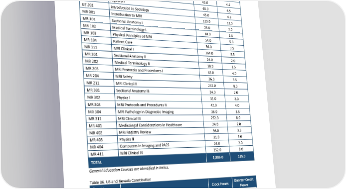 Table 35. ASMRI Program Course Outline Course QuarterCredit Title Clock Hours Number Hours GE001 Biology Basics 45.0 4.5 GE021 Essentials of Anatomy and Physiology 66.0 6.5 GE110 Critical Thinking 45.0 4.5 GE112 AlgebraI 45.0 4.5 GE201 Introduction to Sociology 45.0 4.5 MR001 Introduction to MRI 120.0 12.0 MR101 Sectional Anatomy I 24.0 2.0 MR102 MedicalTerminologyI 18.0 1.5 MR103 Physical Principles of MRI 54.0 5.0 MR104 Patient Care 36.0 3.5 MR111 MRIClinical I 264.0 8.5 MR201 Sectional Anatomy II 24.0 2.0 MR202 MedicalTerminologyII 18.0 1.5 MR203 MRIProtocolsandProceduresI 42.0 4.0 MR204 MRISafety 36.0 3.5 MR211 MRIClinical II 252.0 8.0 MR301 Sectional Anatomy III 24.0 2.0 MR302 Physics I 31.0 3.0 MR303 MRIProtocolsandProceduresII 42.0 4.0 MR304 MRIPathologyinDiagnosticImaging 36.0 3.5 MR311 MRIClinical III 252.0 8.0 MR401 Medicolegal Considerations in Healthcare 24.0 2.0 MR402 MRIRegistryReview 36.0 3.5 MR403 Physics II 31.0 3.0 MR404 ComputersinImagingandPACS 24.0 2.0 MR411 MRIClinical IV 252.0 8.0 TOTAL 1,886.0 115.0 GeneralEducationCoursesareidentifiedinItalics. Table 36. US and Nevada Constitution Course QuarterCredit Title Clock Hours Number Hours SNO001 USandNevadaConstitution* 0.0 0.0 *This satisfies the Nevada Constitution requirement NRS 394.150 and is only required for students who reside in Nevada. A.S. in MRI Program Information, Length, and Schedule The Associate of Science in MRI program provides a library. The Instructor-to-Student ratio is 1:20 during 188